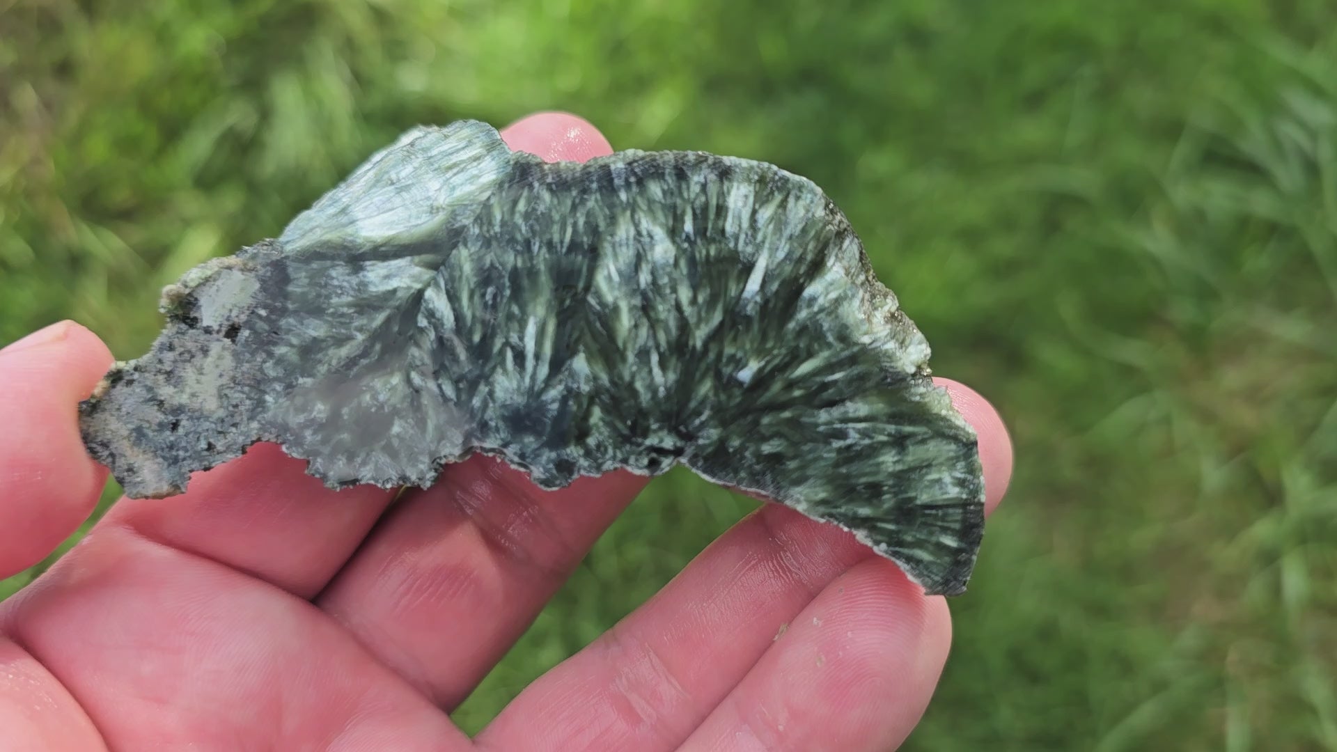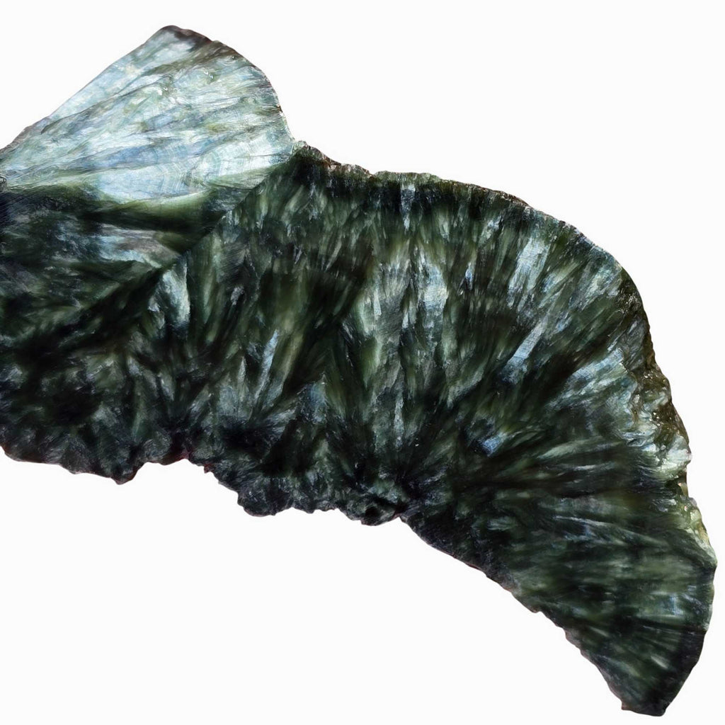 A cut and proven Seraphinite endcut with shimmering green feather-like chatoyance—a rare and beautiful collector’s specimen from Siberia.