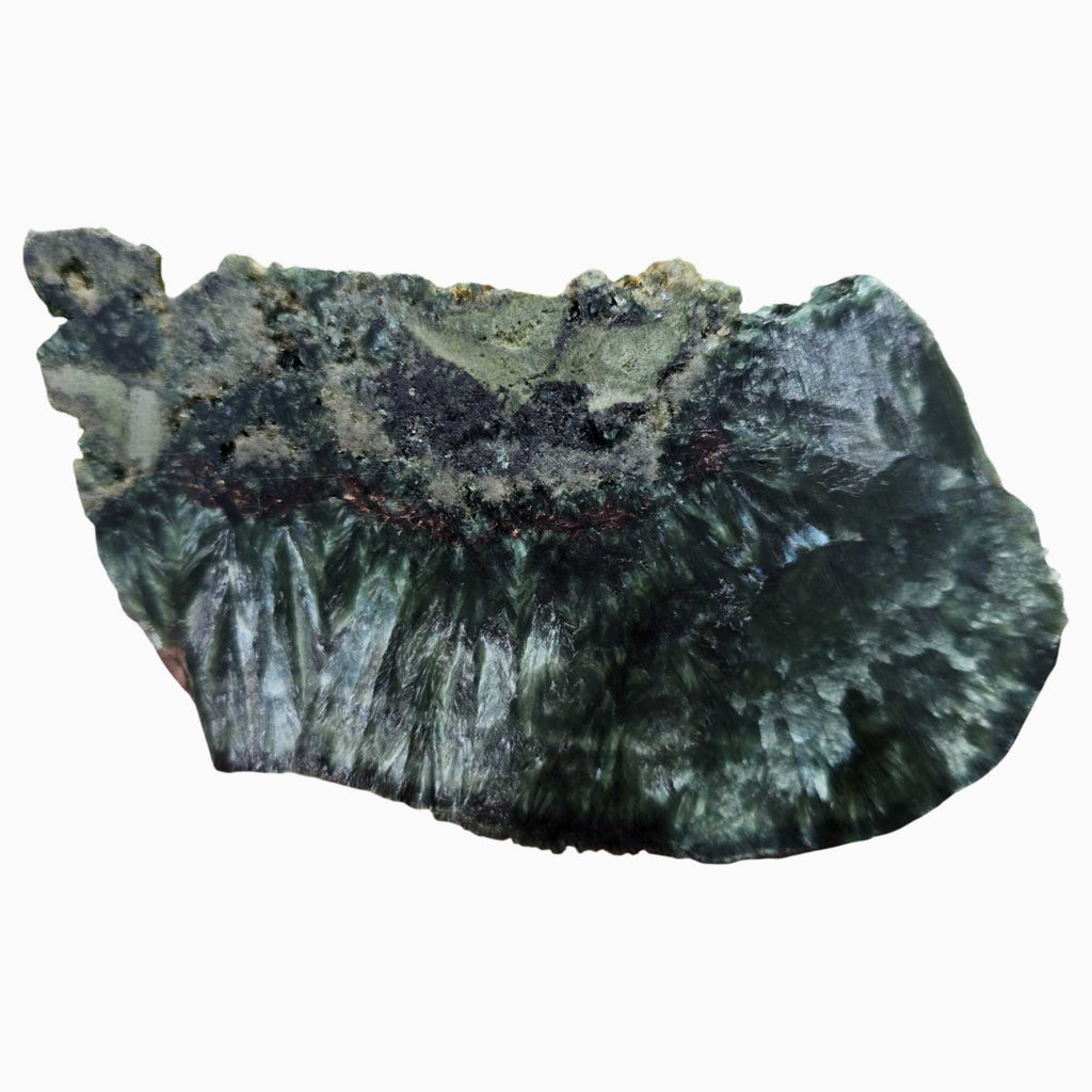 This is a beautiful Seraphinite slab displaying the feathery, shimmering chatoyance that makes this stone so prized. Its patterned surface has strong visual appeal, and at 2 oz, it’s an excellent size for cabbing or adding as a specimen to a collection.