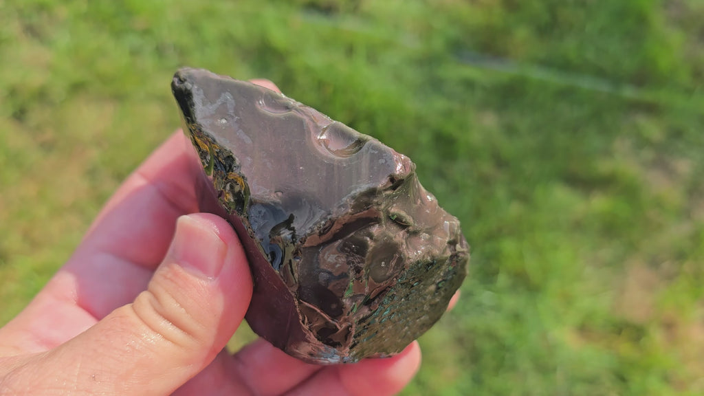 This piece of Velvet Obsidian displays a rare smokey purple flow running through the body of the stone. At 11 oz, it’s sized perfectly for slabbing on a 10-inch saw, making it an excellent choice for producing unique cabbing slabs. The rich internal movement and old stock provenance make this a beautiful and versatile cutter.