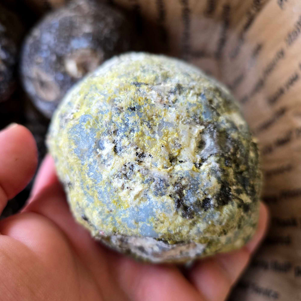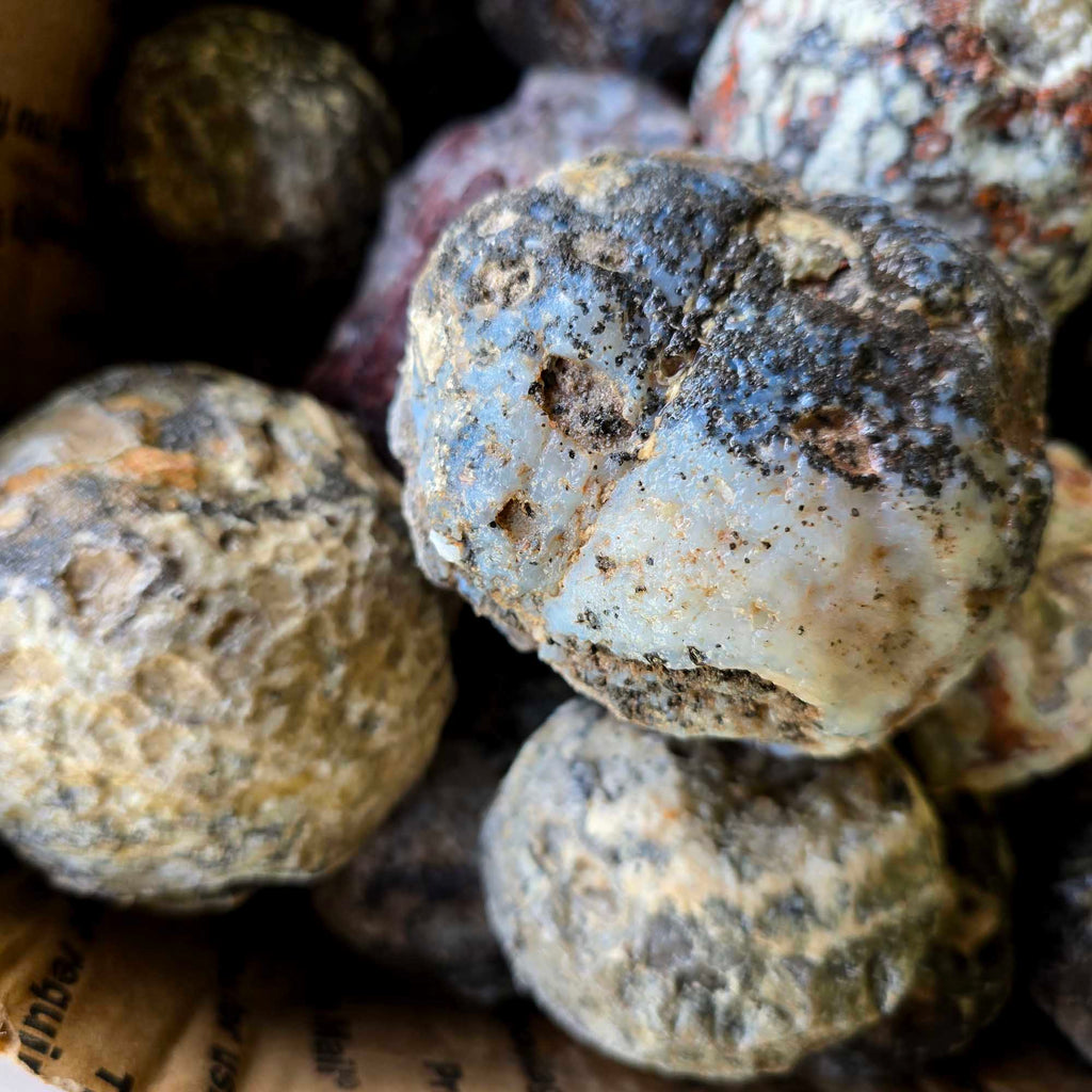 Unique Characteristics: Solid agate-filled geodes, often with blue agate and quartz interiors, occasional jasper-filled specimens, hand-selected old stock
