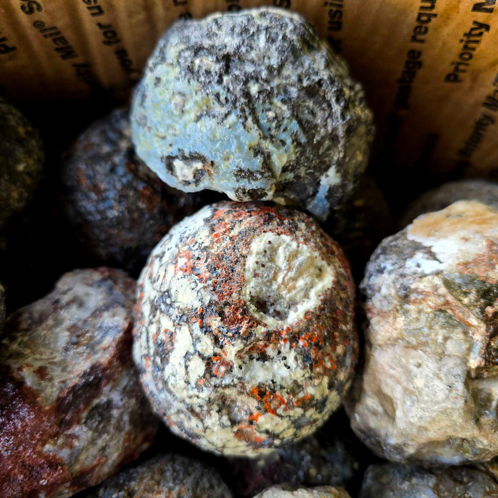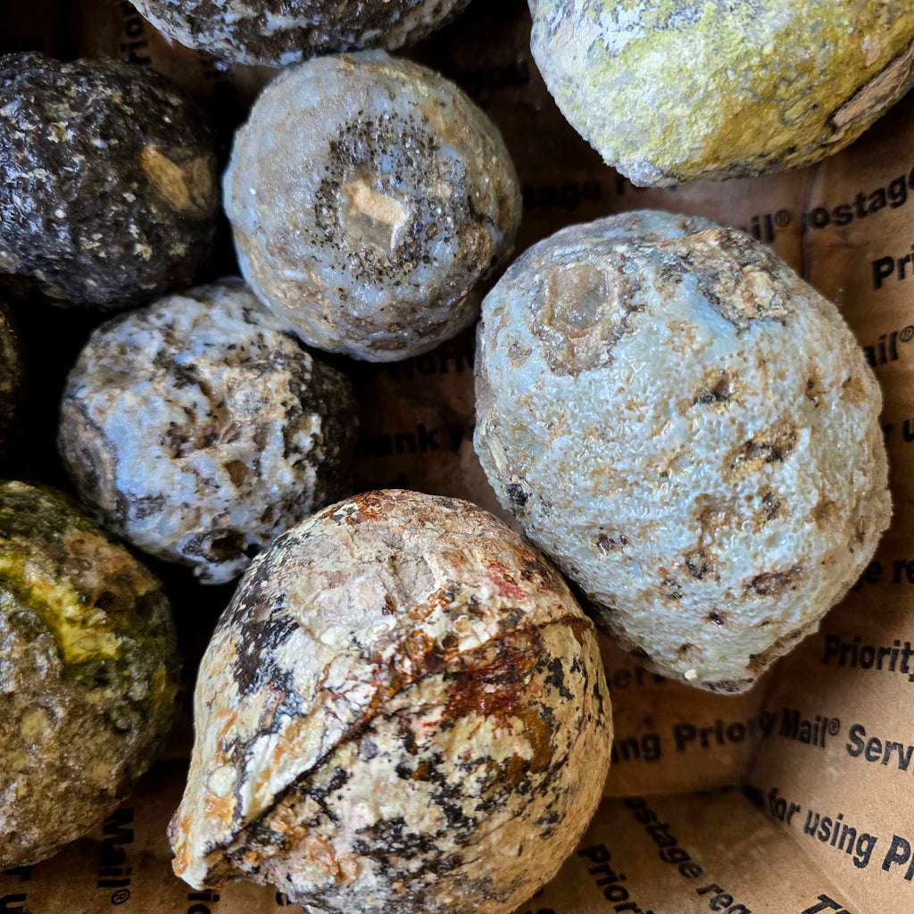 A substantial 27.5 lb box of Solid Coconut Geodes, hand-selected for their agate and quartz interiors—an excellent opportunity for both lapidary work and collecting.