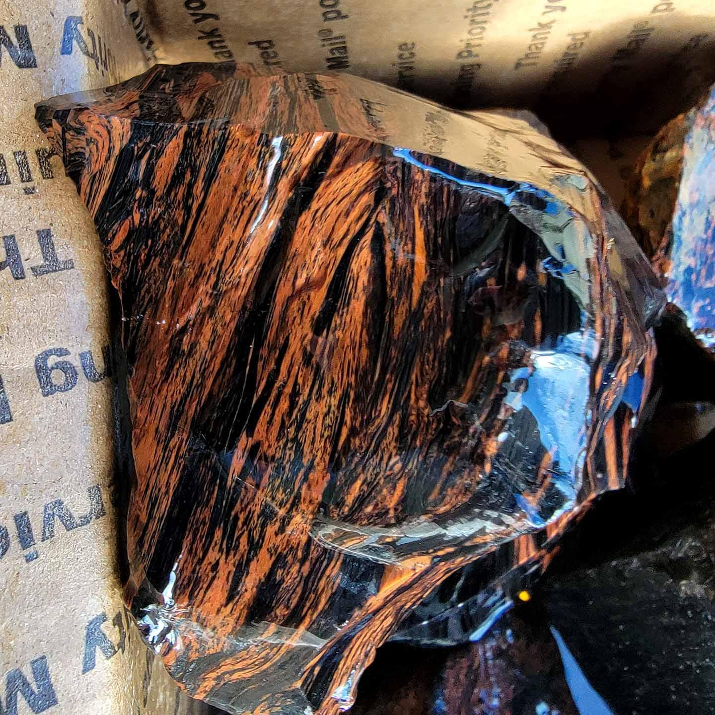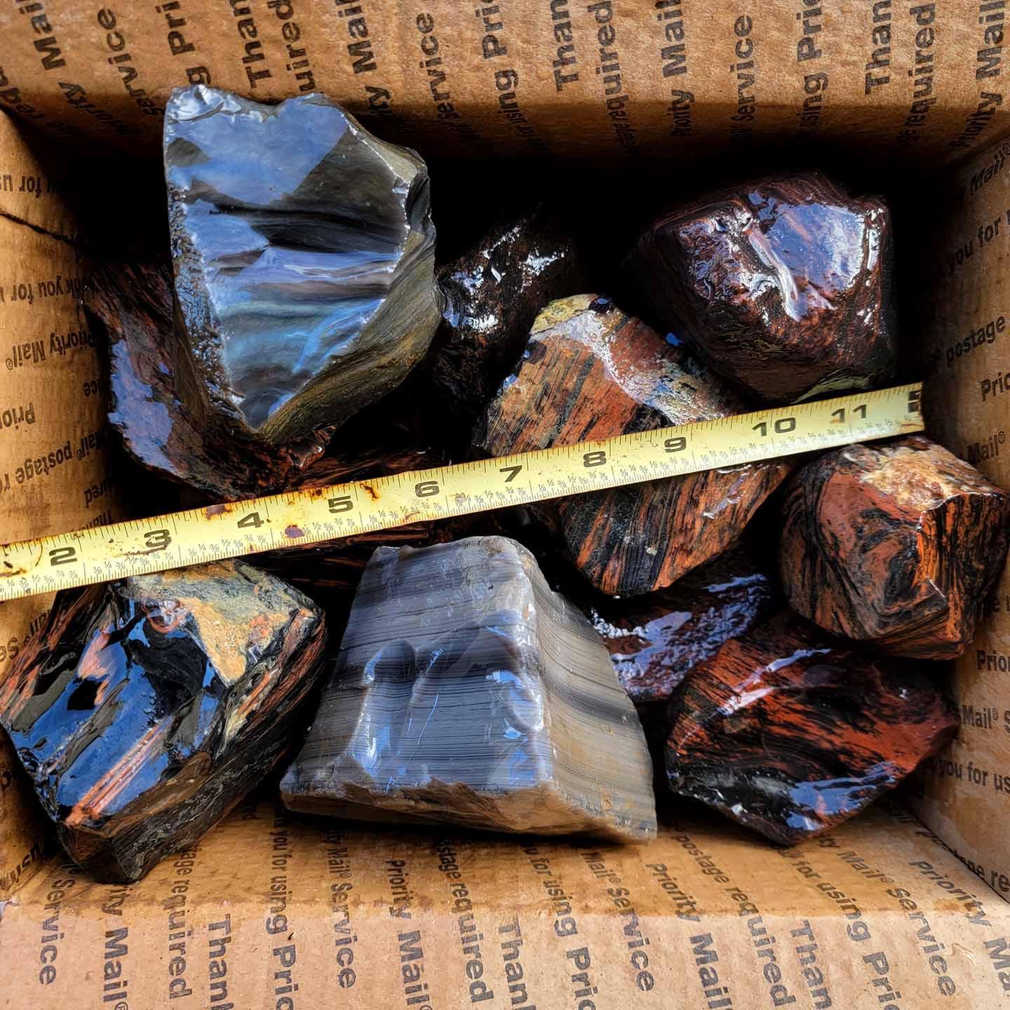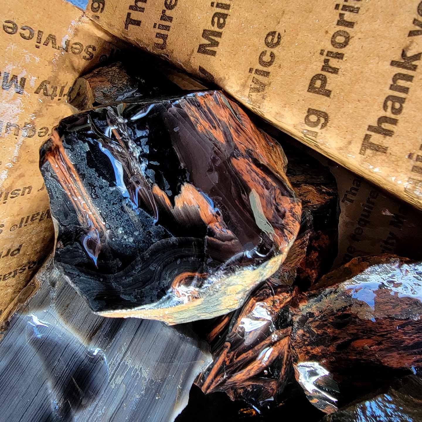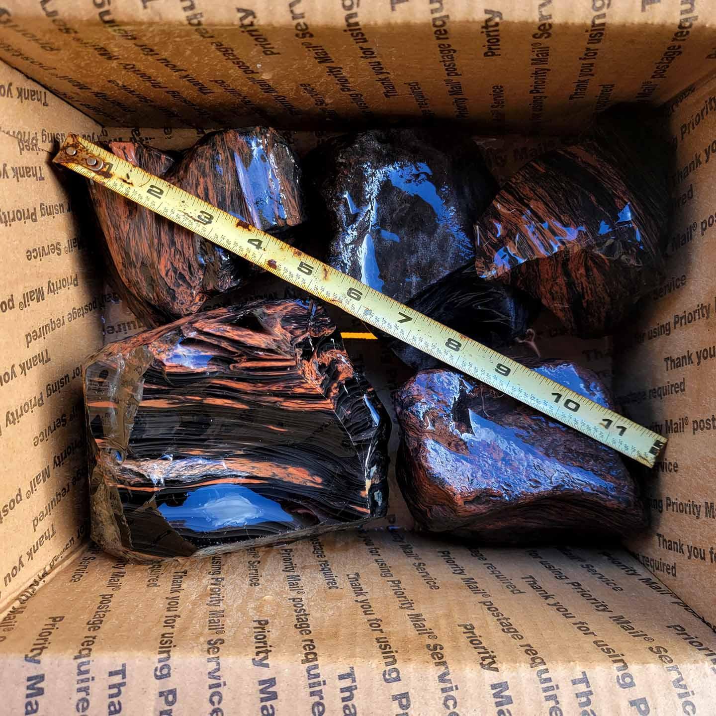 Here is a stunning batch of Old Stock Mahogany Obsidian, Tri-Flow Obsidian, Rainbow Obsidian, Starburst Silver Sheen Obsidian, and some unidentified Obsidian from Glass Butte Oregon! Each one is sure to cut stunning slabs for cabs, or could be used for knapping arrowheads! This is from the same mountain that Native Americans use to collect from and knap from across the West Coast! This is certainly one prime box of beautiful material you won't want to miss out on! This box is from my own personal cutting rough pile!