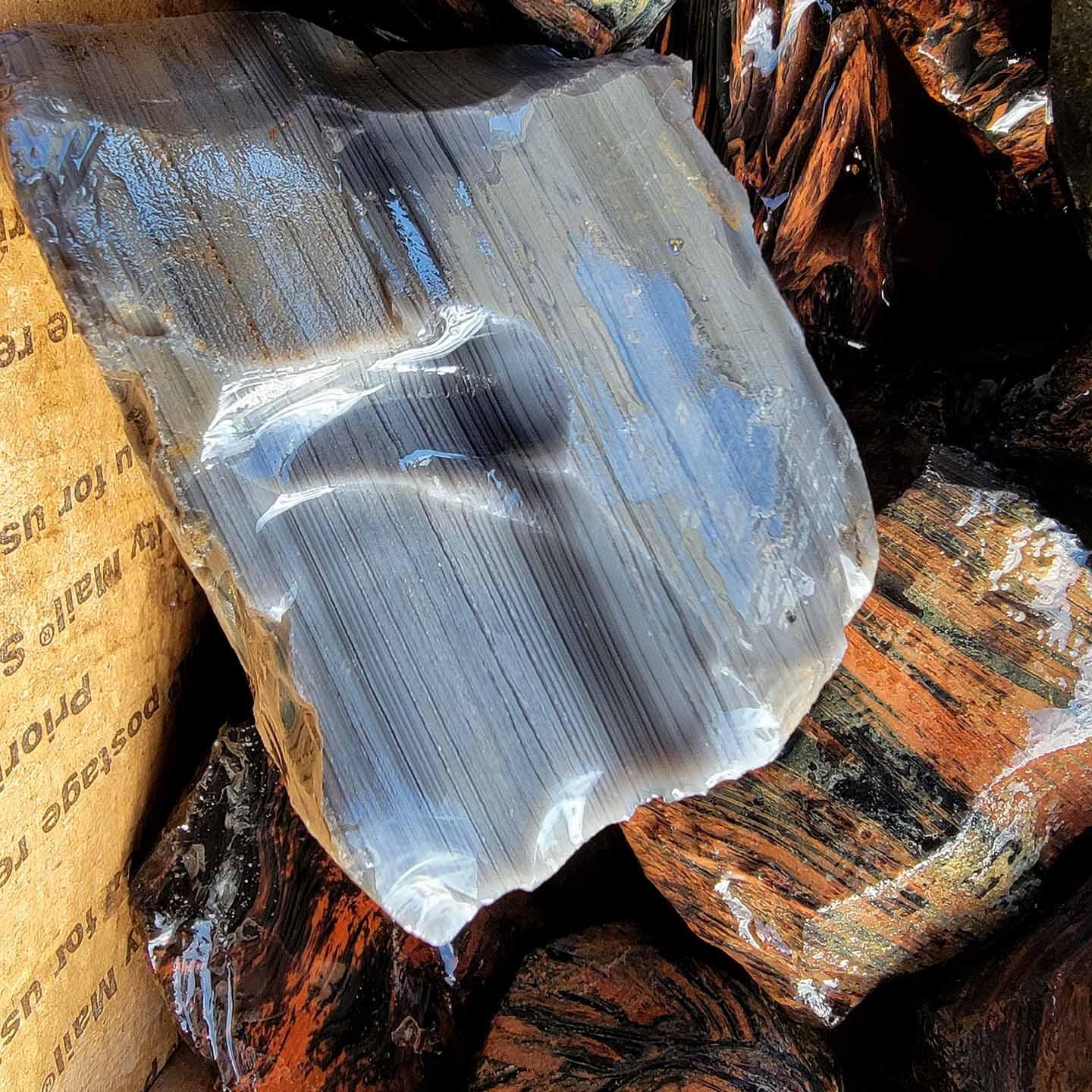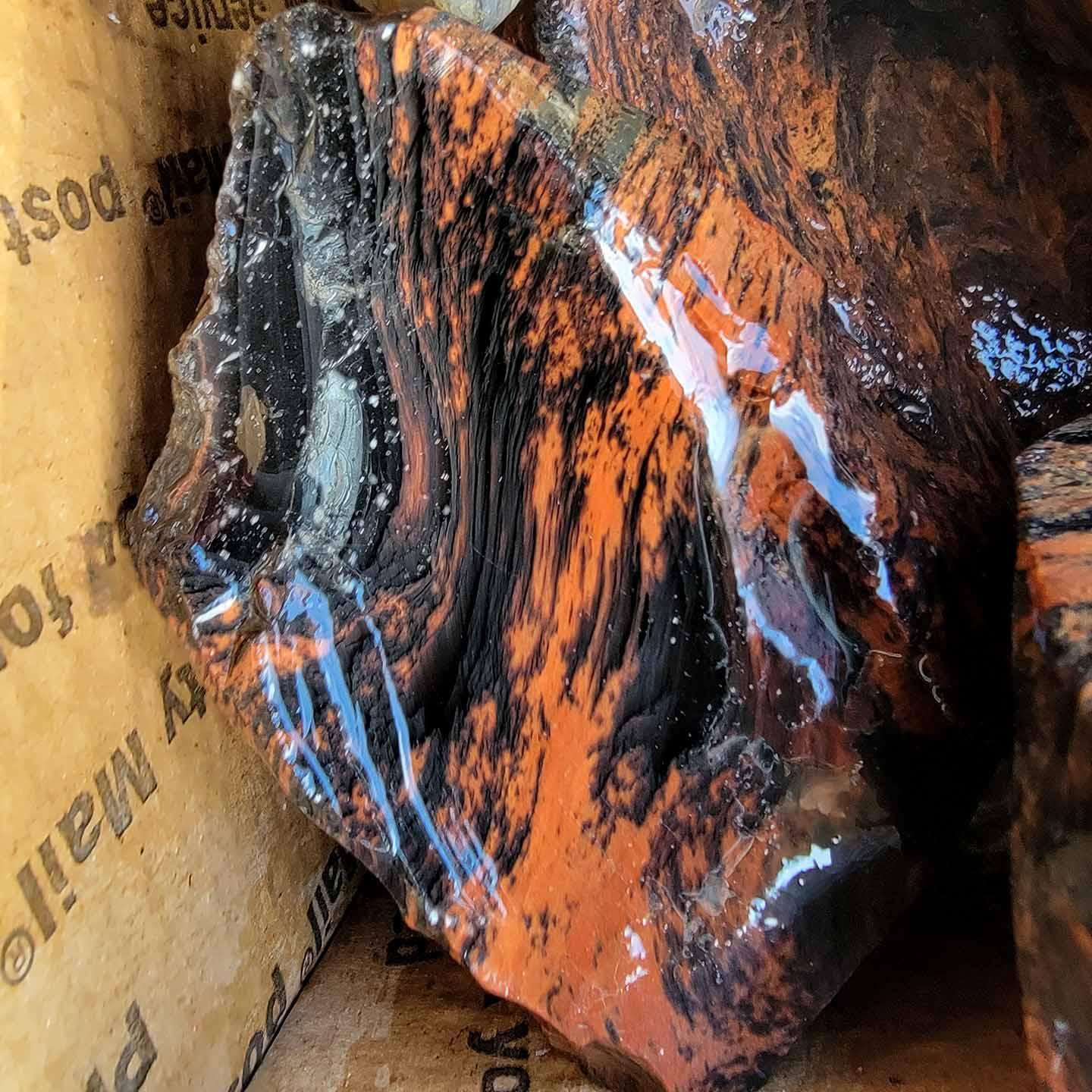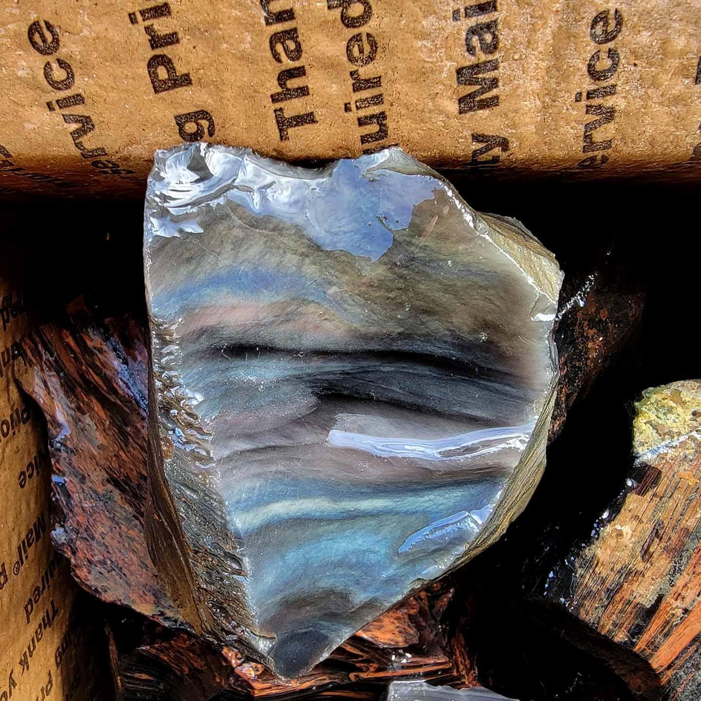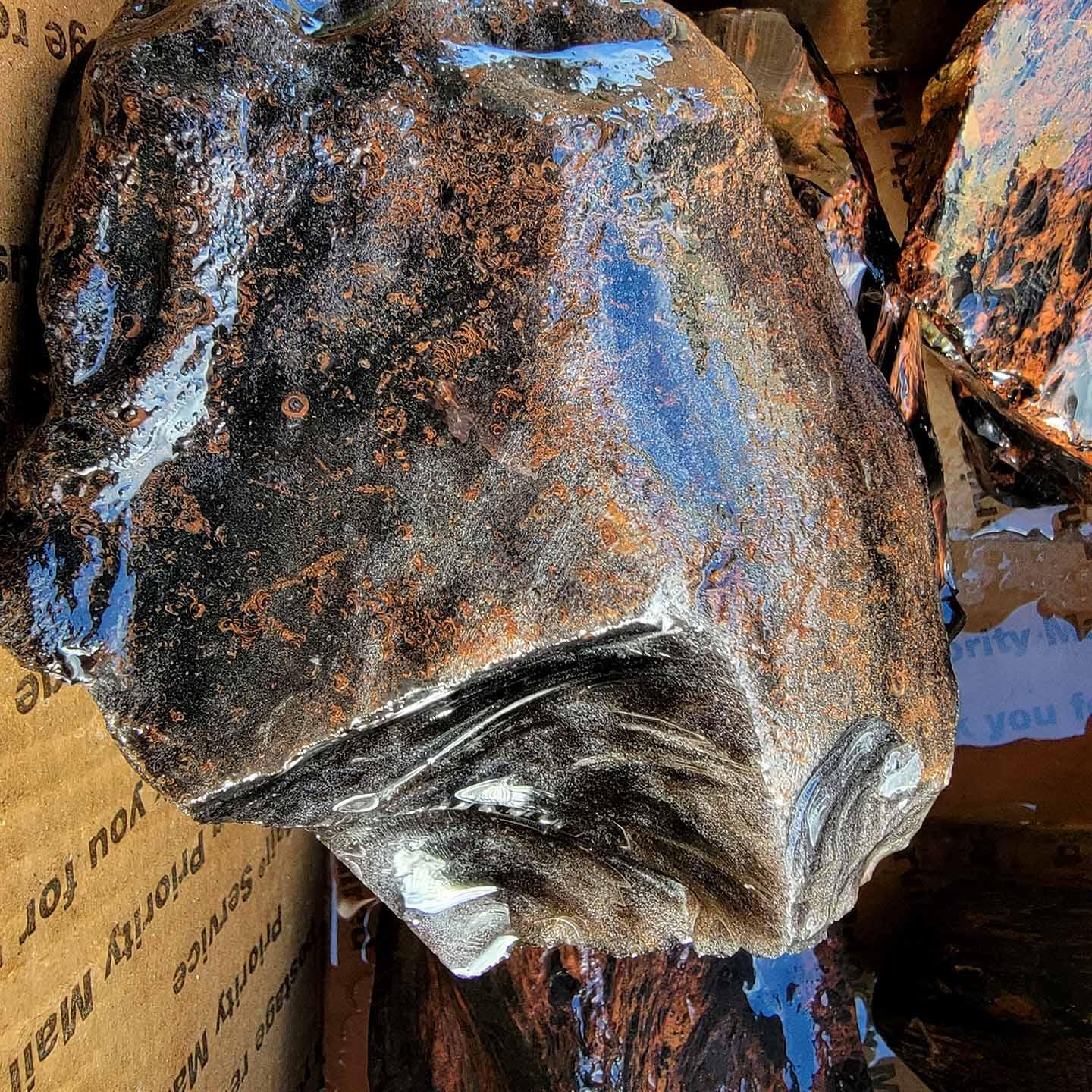 Here is a stunning batch of Old Stock Mahogany Obsidian, Tri-Flow Obsidian, Rainbow Obsidian, Starburst Silver Sheen Obsidian, and some unidentified Obsidian from Glass Butte Oregon! Each one is sure to cut stunning slabs for cabs, or could be used for knapping arrowheads! This is from the same mountain that Native Americans use to collect from and knap from across the West Coast! This is certainly one prime box of beautiful material you won't want to miss out on! This box is from my own personal cutting rough pile!
