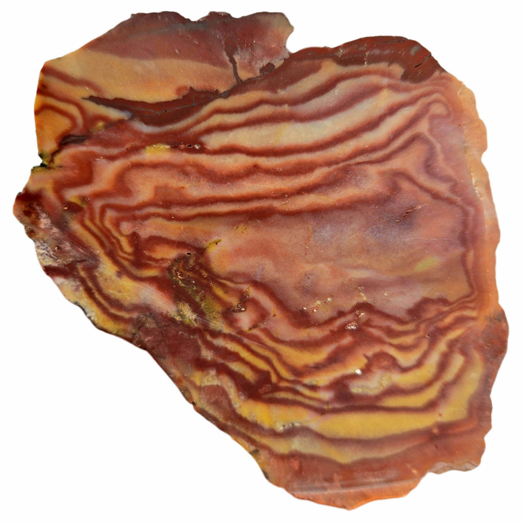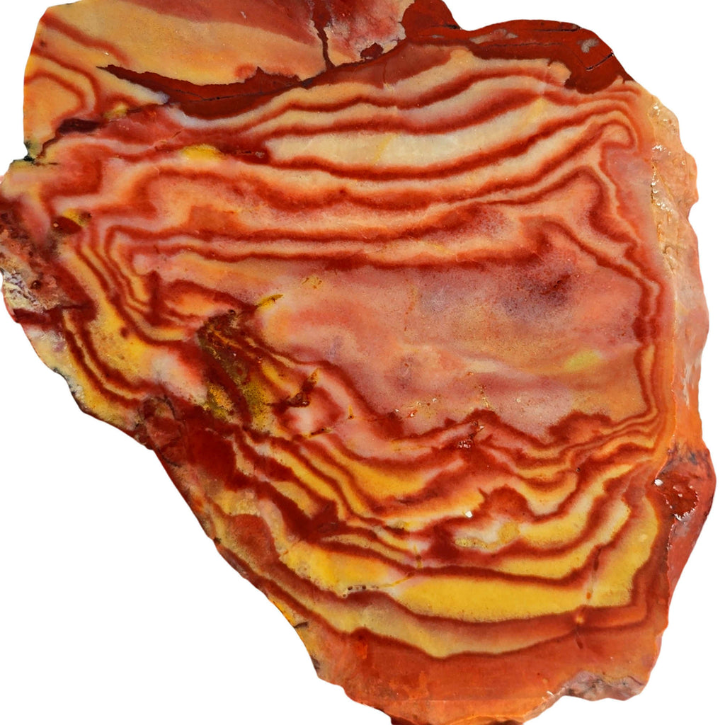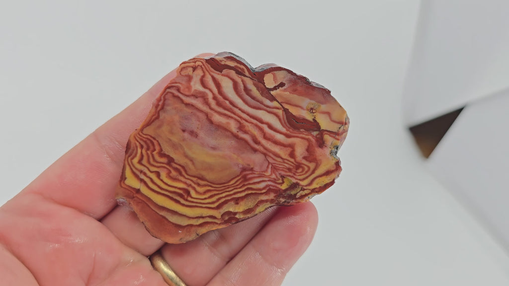 This piece features exceptional Liesegang banding with dramatic red flow currents. The high silica content ensures a superior polish and vibrant color display.