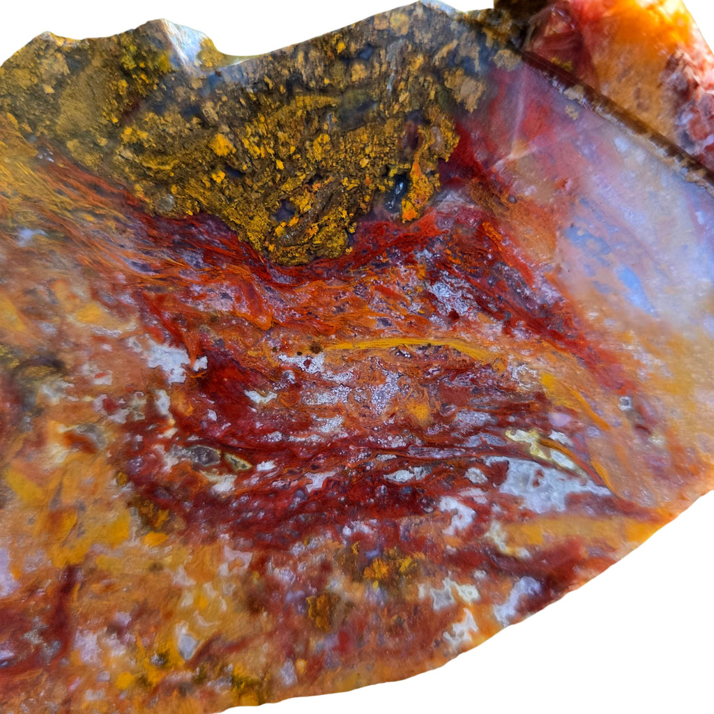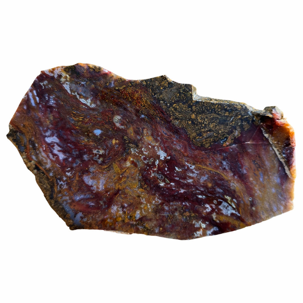 This piece features exceptional moss definition in vivid red coloring. The quartz and white agate inclusions create natural texture and sparkle that will enhance finished cabochons.