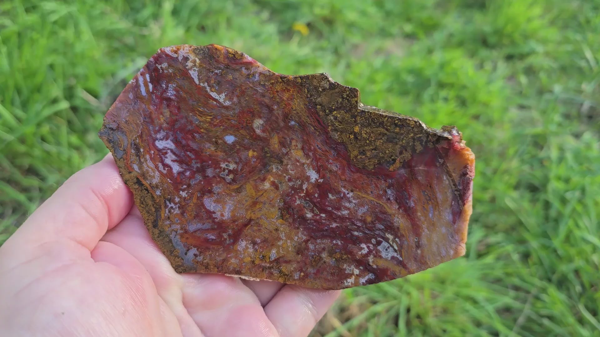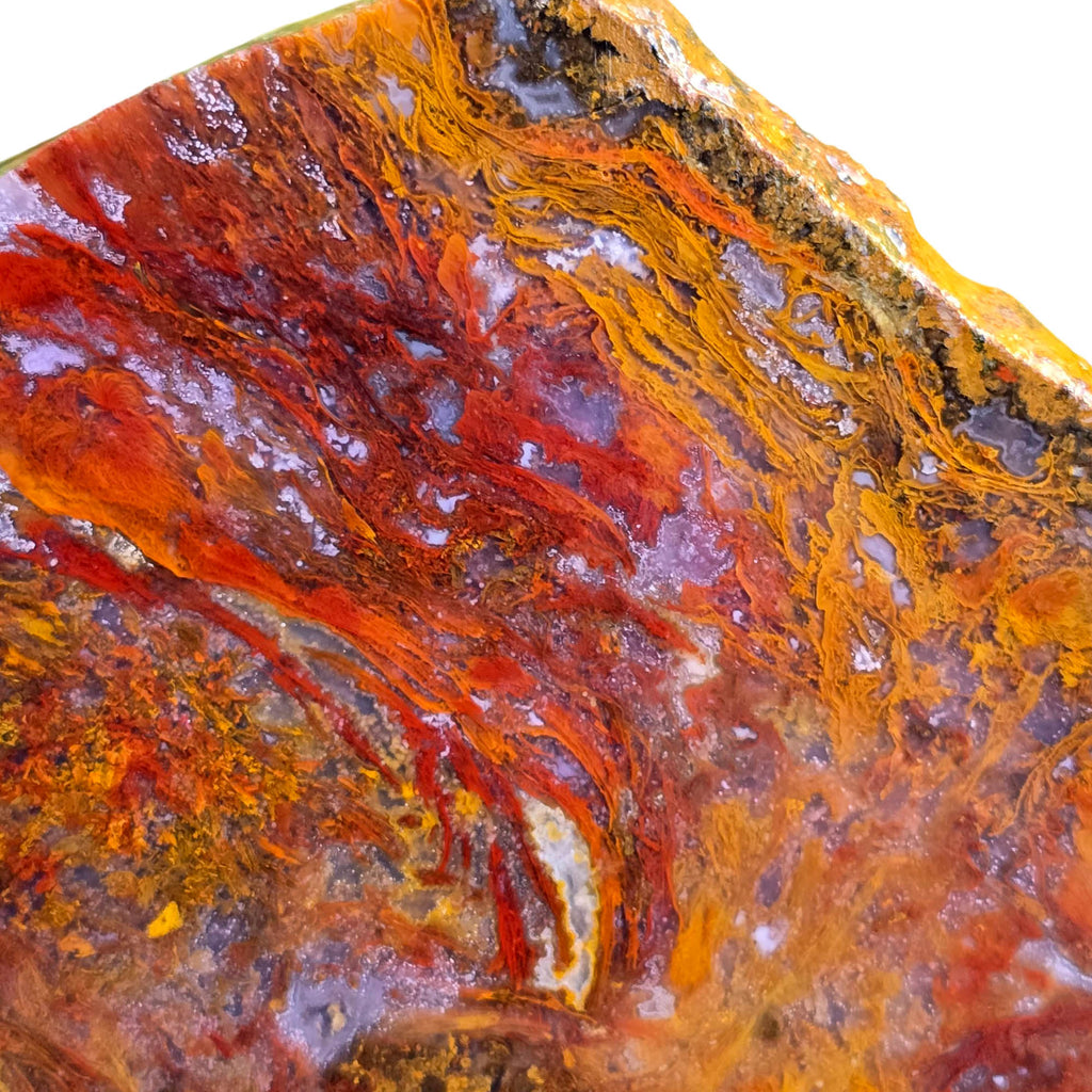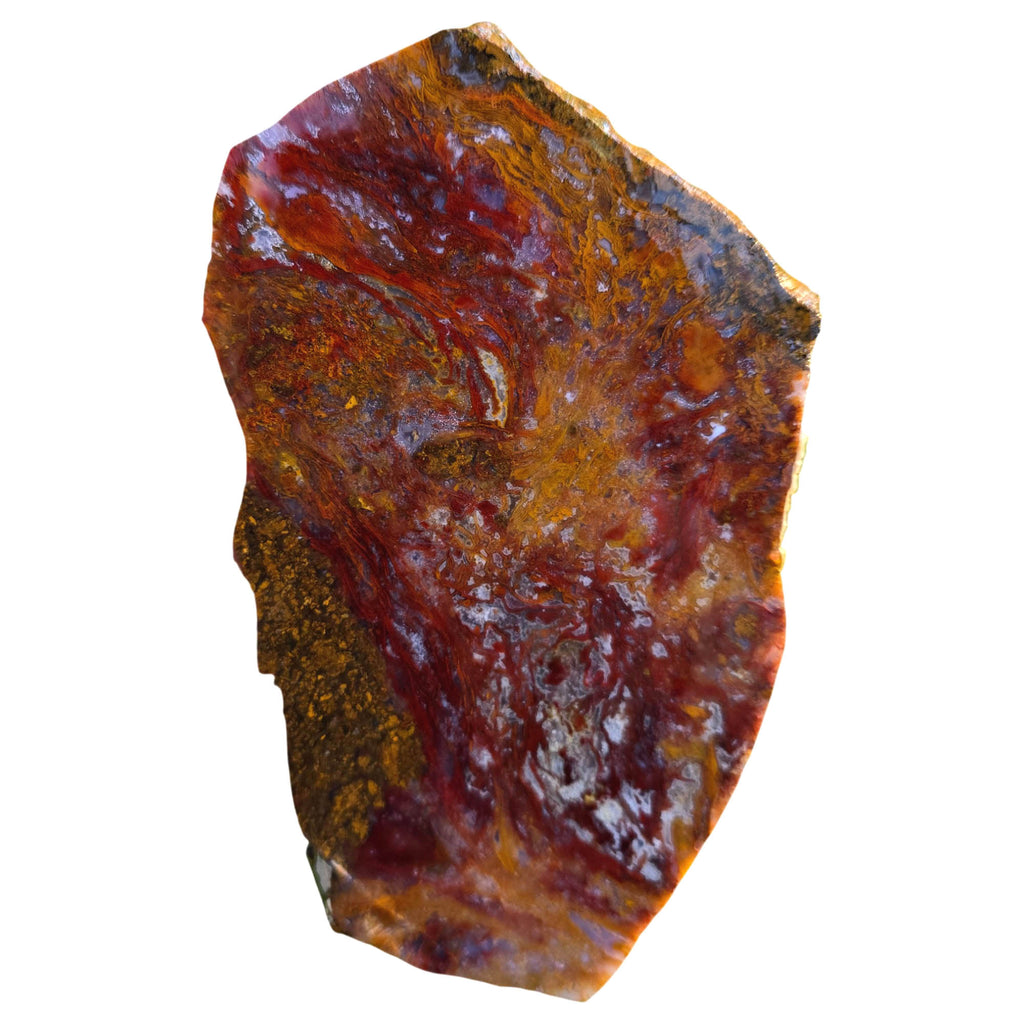 This neat red slab of Agua Nueva Moss agate shows really well-defined red moss on static orange background. This one has quartz inclusions and white agate inclusions that should make really neat cabochons with natural sparkle.