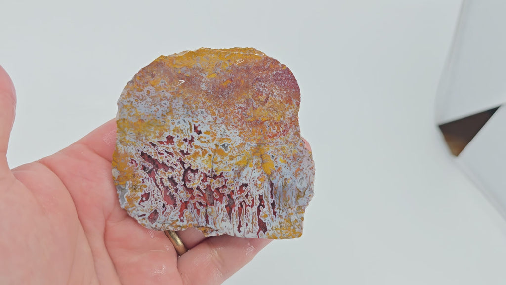Apple Valley Agate comes from the Sahara Desert, collected by nomadic shepherds, offering remarkable variety for agate collectors and jewelry makers. This Moroccan agate offers nearly unlimited diversity, with nearly every piece being unique. Features can include pseudomorphic tubes, moss in various colors, picturesque patterns, plumes, and poppies in shades of red, green, orange, blue, purple, and pink. Hardness can vary between specimens of this desert agate, but it generally takes a quality polish and works into designer-grade cabochons.