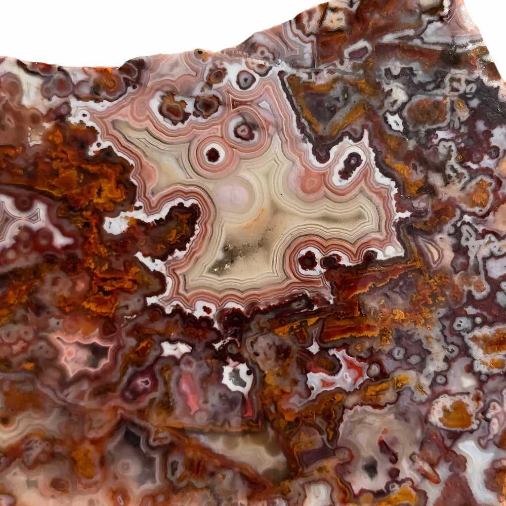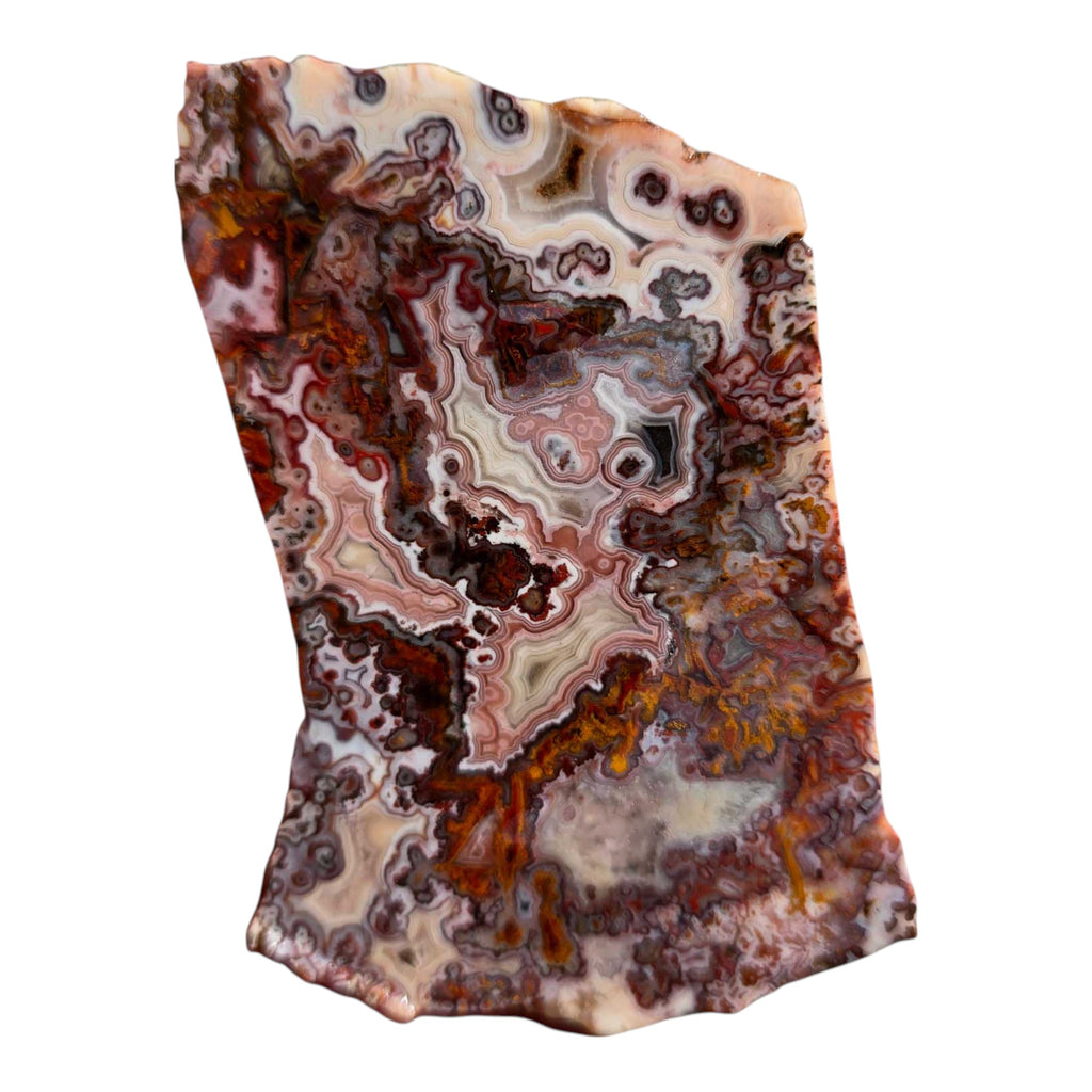 This Apple Valley Agate slab has so much going on—tight fortification with high contrast, flowing moss agate formations, and subtle quartz inclusions all woven together in a burst of earthy tones. It’s the kind of stone that reveals something new each time you look at it.