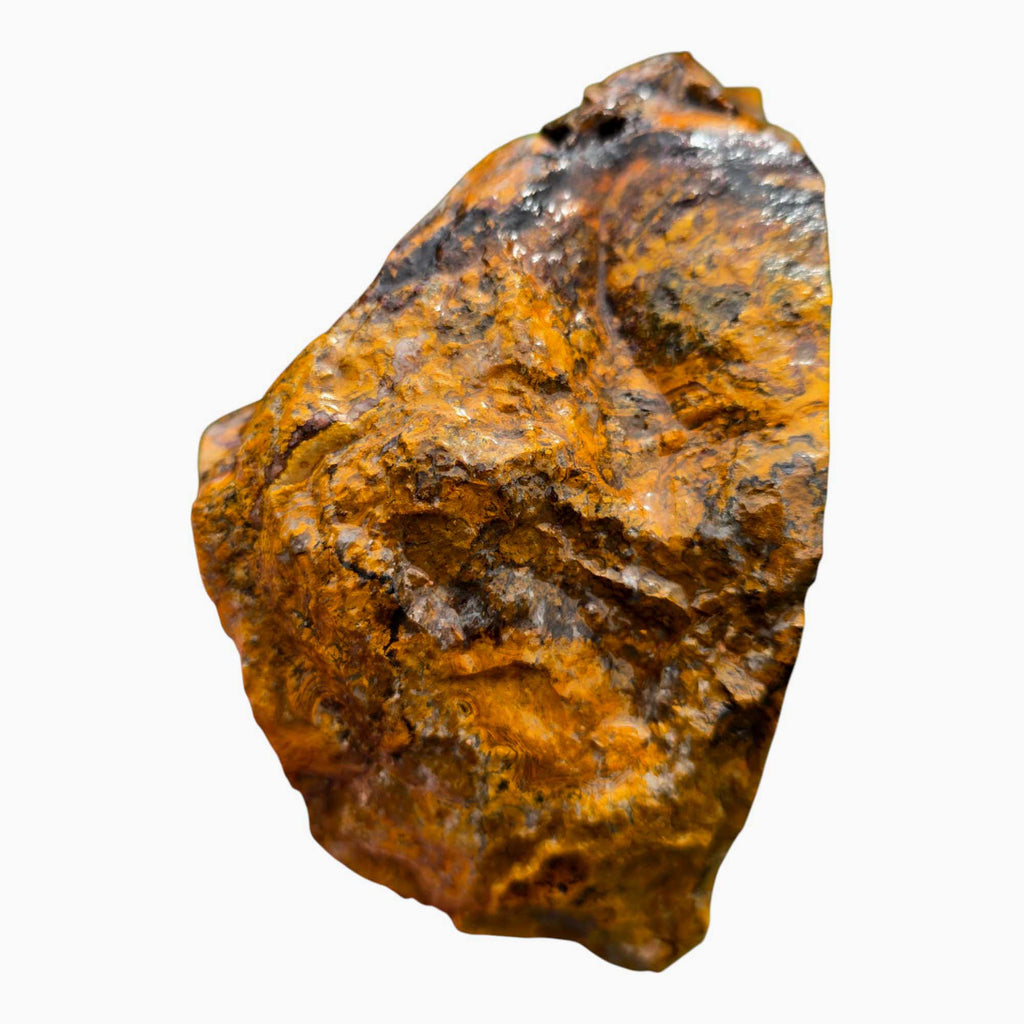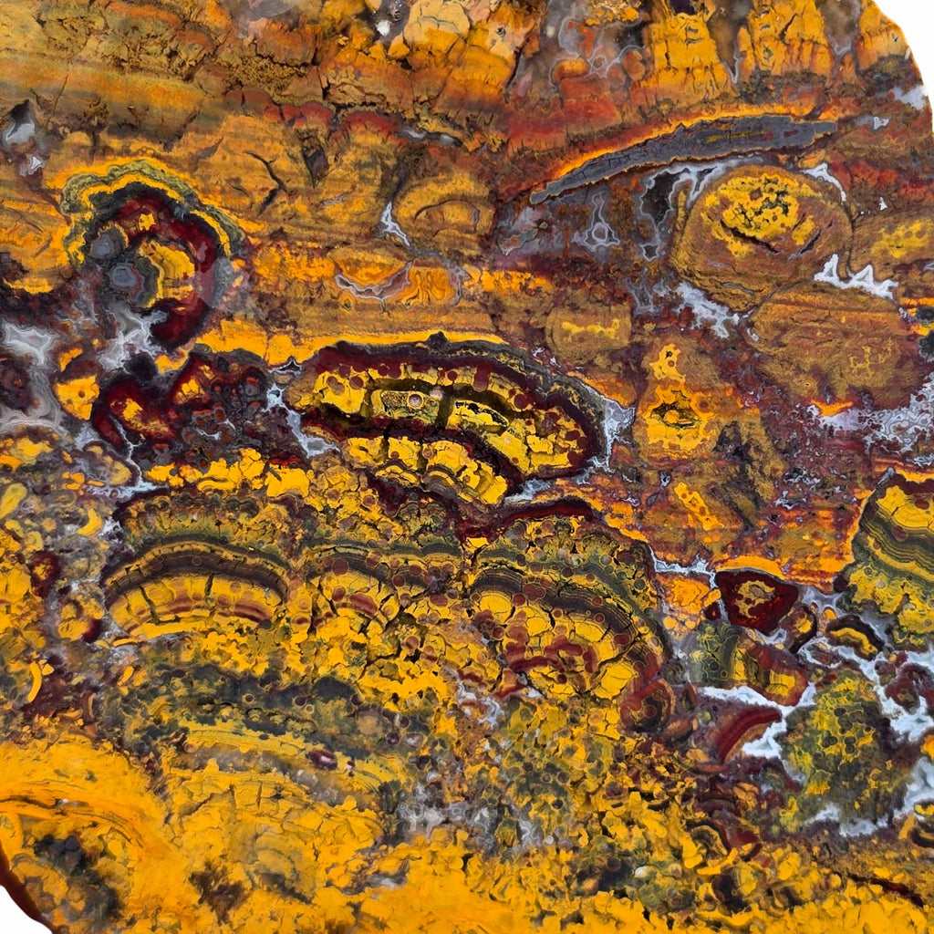 Apple Valley Jasper is collected from the exact location of the famous Apple Valley Agate (Sahara Desert of Morocco), but it is a fossil stromatolite. Stromatolites are ocean-colonizing bacteria called cyanobacteria that get trapped in sediment layers. Stromatolites are one of the earliest known fossils; in some locations worldwide, they are still being formed. With Apple Valley Jasper, each layer is a unique story, as the geological events and mineral contents of the surrounding water and sediment give it the color and pattern it displays. Apple Valley Jasper often features bright reds, with gorgeous lines displayed. They can also have hematite flowers, which create some captivating cabochons. Apple Valley Jasper takes an excellent polish.