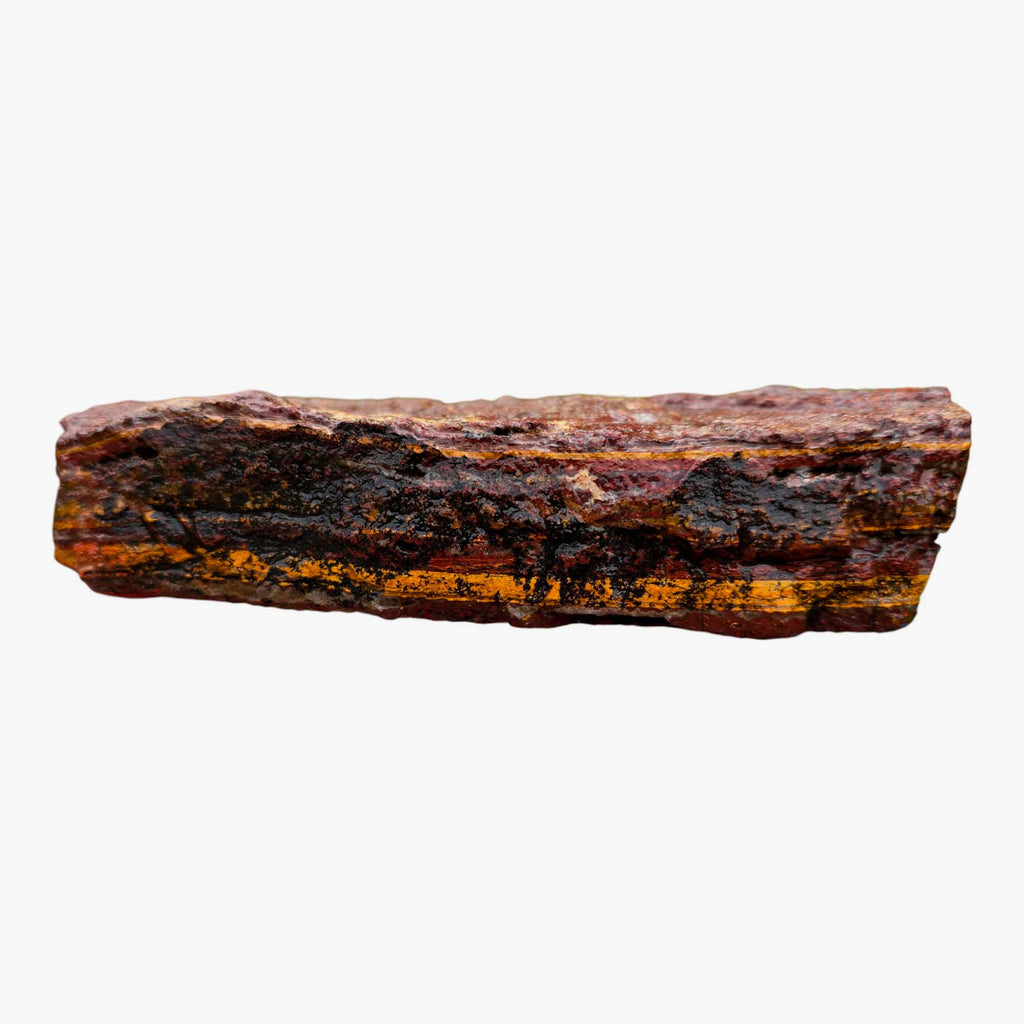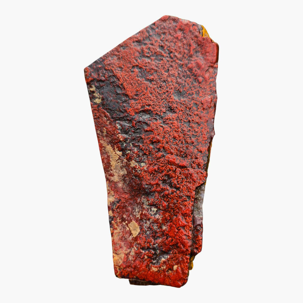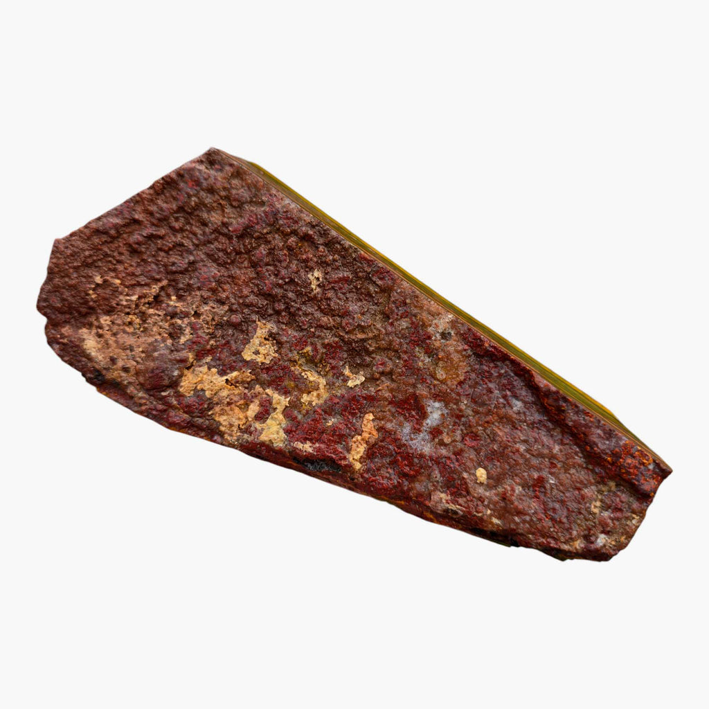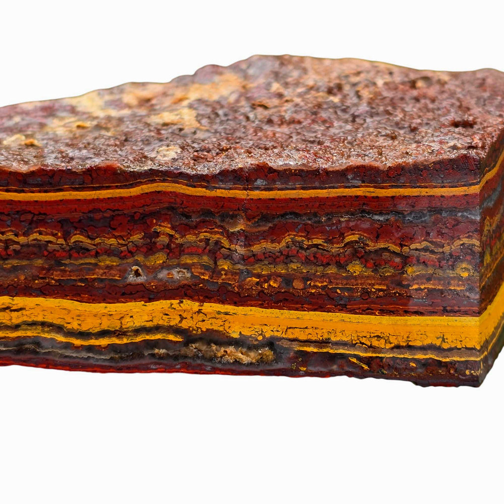 Apple Valley Jasper is collected from the exact location of the famous Apple Valley Agate (Sahara Desert of Morocco), but it is a fossil stromatolite. Stromatolites are ocean-colonizing bacteria called cyanobacteria that get trapped in sediment layers. Stromatolites are one of the earliest known fossils; in some locations worldwide, they are still being formed. With Apple Valley Jasper, each layer is a unique story, as the geological events and mineral contents of the surrounding water and sediment give it the color and pattern it displays. Apple Valley Jasper often features bright reds, with gorgeous lines displayed. They can also have hematite flowers, which create some captivating cabochons. Apple Valley Jasper takes an excellent polish.