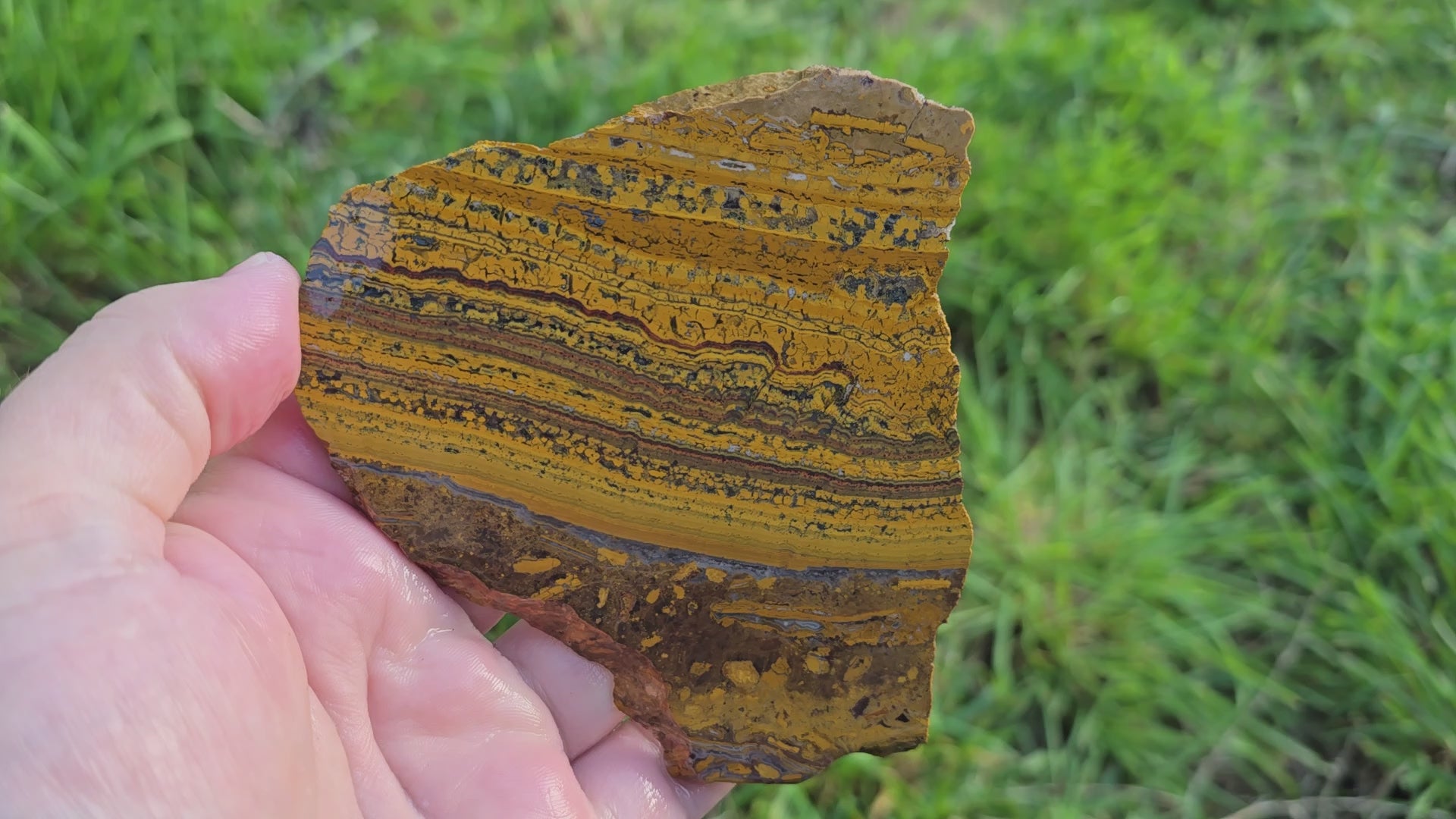 This neat banded gold slab of Apple Valley Jasper shows great stromatolite patterns where you can see the individual colonies along with oolitic-like patterns. This one would make nice cabochons or be a nice display just as it is, with neat hematite adding character to the banded lines.