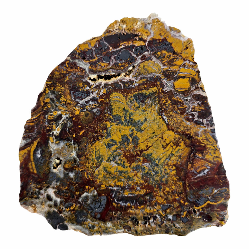 This impressive slab of Apple Valley Jasper showcases hematite flowering surrounded by broken stromatolite patterns and what appears to be fossil oyster shells. The piece has incredible micro detail throughout, making it perfect for a stunning display or source for great cabochons with multiple fossil features.