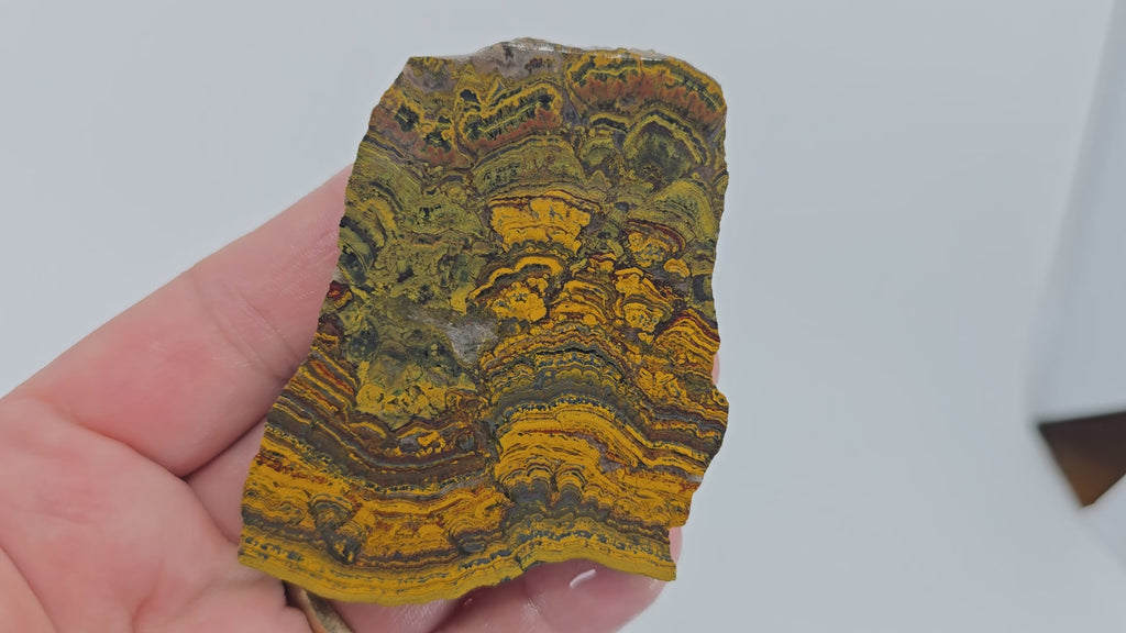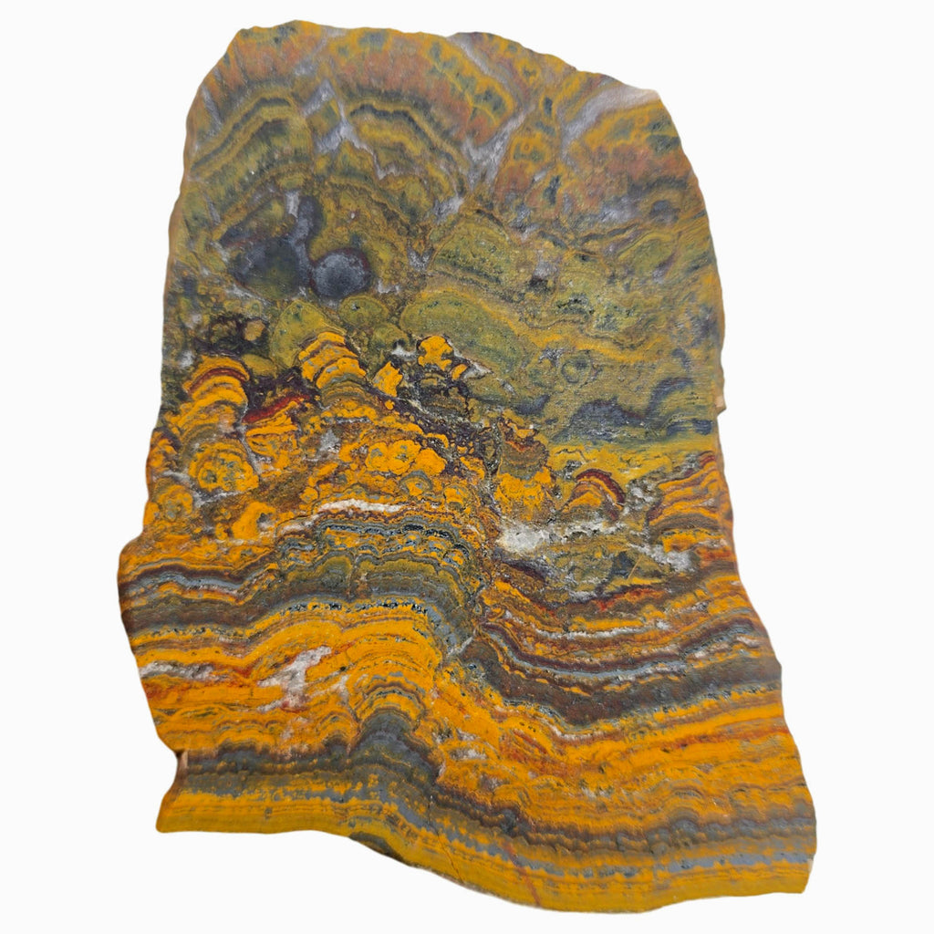 This stunning slab showcases beautiful hematite flowers arranged along wavy lines of hematite and jasper, creating a natural fossil display. Each layer represents a billion-year-old geological event, preserved in this ancient stromatolite. This piece will make exceptional cabochons or serve as a captivating display of natural history.