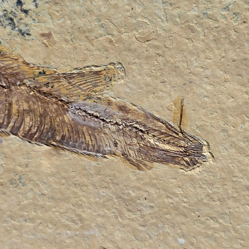 Knightia was a small schooling fish that thrived in the Eocene’s warm freshwater lakes. These mass mortality fossils are believed to have been caused by rapid environmental changes, such as algal blooms or sudden shifts in temperature and oxygen levels, resulting in entire schools of fish being preserved together in the fine lake sediments.