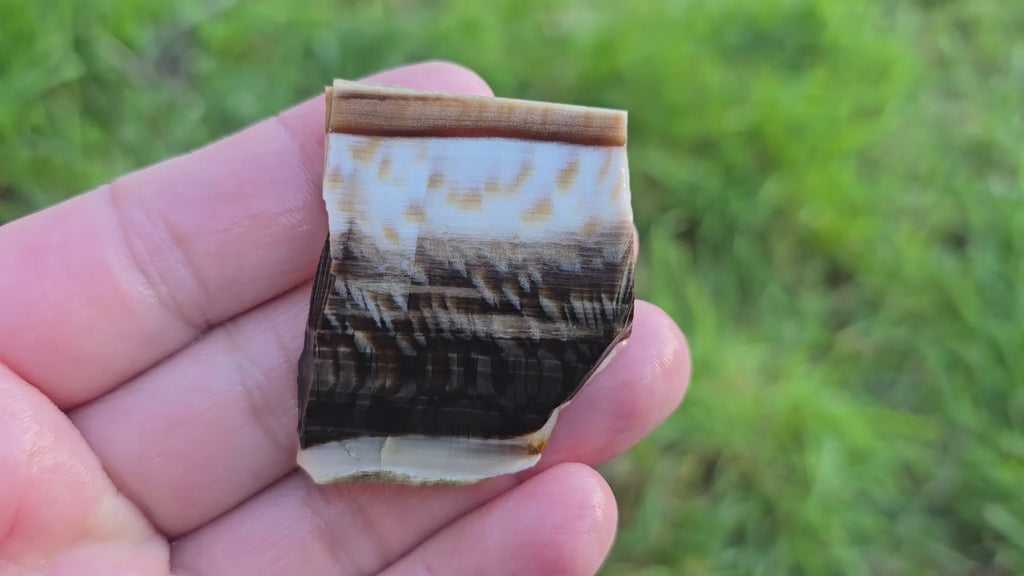This exceptional opalite Badger Pocket slab showcases the distinctive sycamore wood grain this ultra-rare material is famous for. The piece displays a stunning yin yang black and white contrast creating a balanced, artistic composition. Sized perfectly for one cabochon, this irreplaceable specimen comes from the single tree extracted in the 1940s before the site became a military firing range.