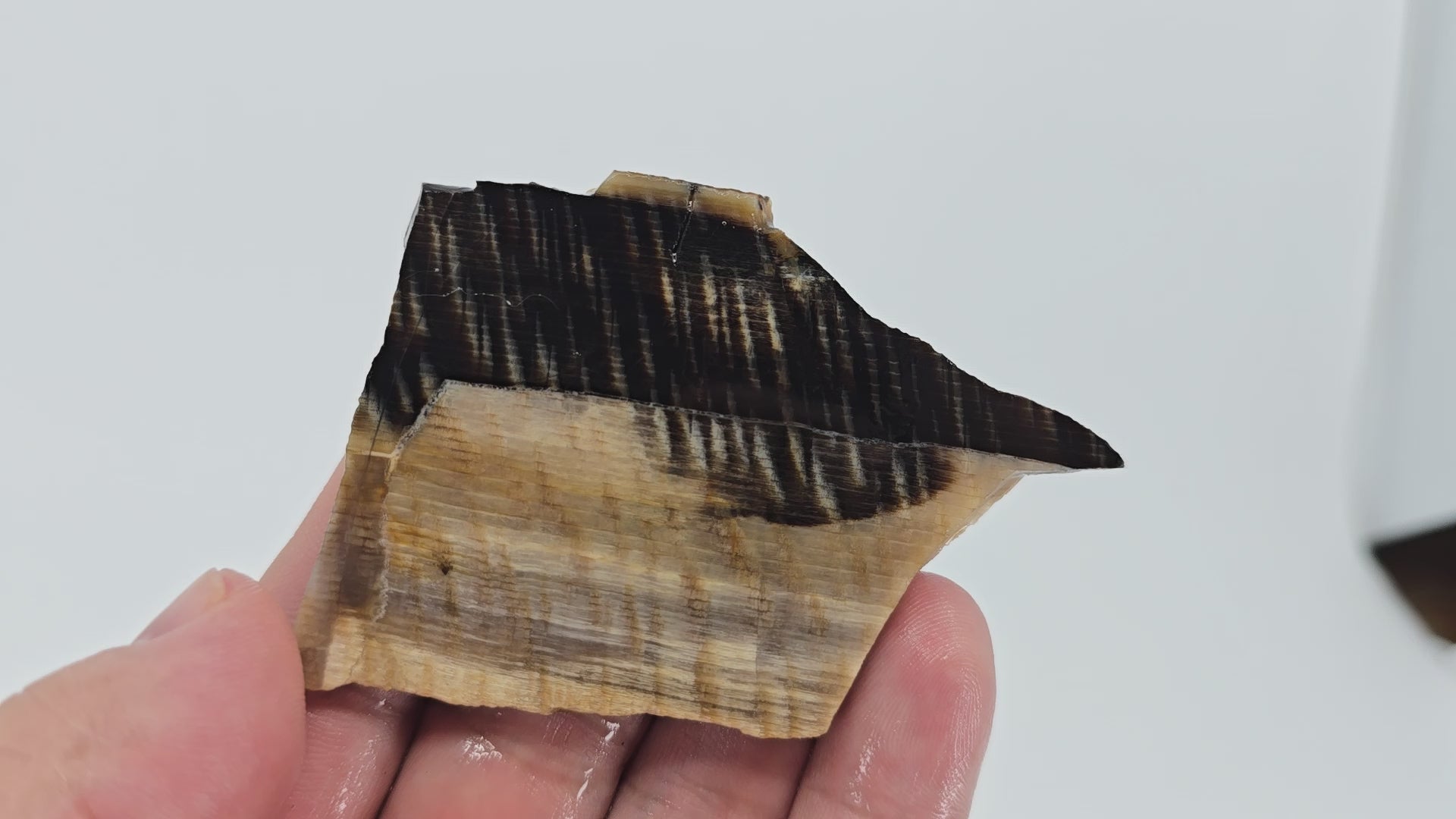 This piece features gorgeous opalized preservation with dramatic black and caramel contrast. The yin-yang pattern makes this an exceptional display or collector specimen.
