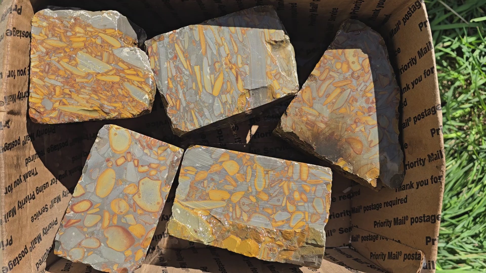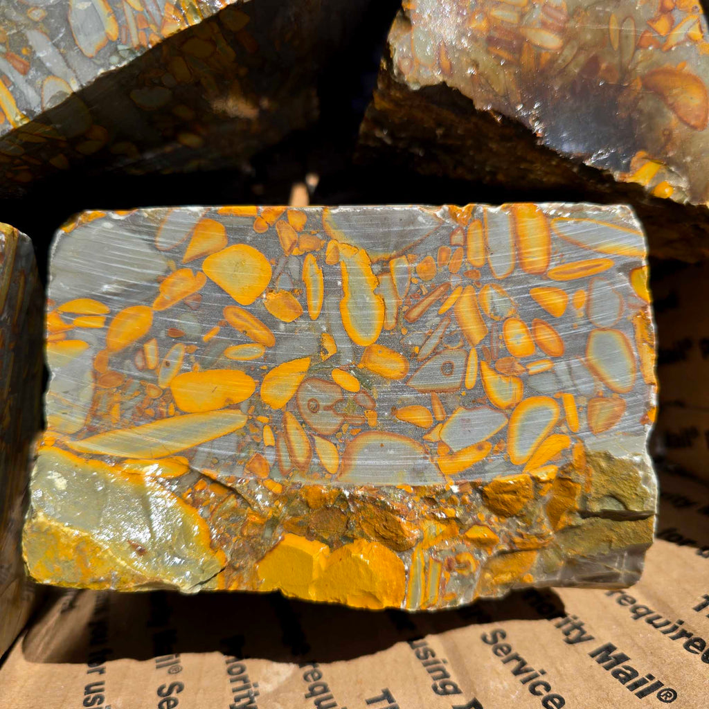 This 23 lb flatrate box of Bamboo Jasper from Indonesia is a high-grade selection of cutting rough showing the iconic banded bamboo-like pattern. It’s a prime, solid batch ideal for lapidary cutters, with plenty of potential for designer cabochons and unique displays. A beautiful chance to work with one of Indonesia’s classic lapidary materials. These have been precut on multiple sides due to import laws. This works great for you, as you can see each one is a high grade cutter with stunning pattern exposed. Â