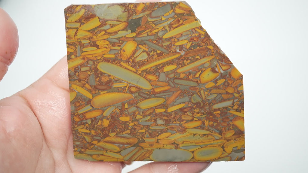 Bamboo Jasper is a unique conglomerate jasper from Indonesia named for its striking resemblance to bamboo fossils. While not believed to contain actual fossil material, it does work into impressive cabochons with distinctive pattern types that can be rare within jasper varieties. Bamboo Jasper also sometimes goes by Bamboo Leaf Jasper. It's typically very solid, making it popular among sphere makers and sculptors. It tends to take a matte polish without treatment, but with this attractive material, the process is worthwhile. Most Bamboo Jasper is exported pre-cut due to international trade laws within Indonesia.