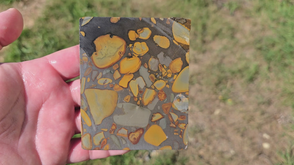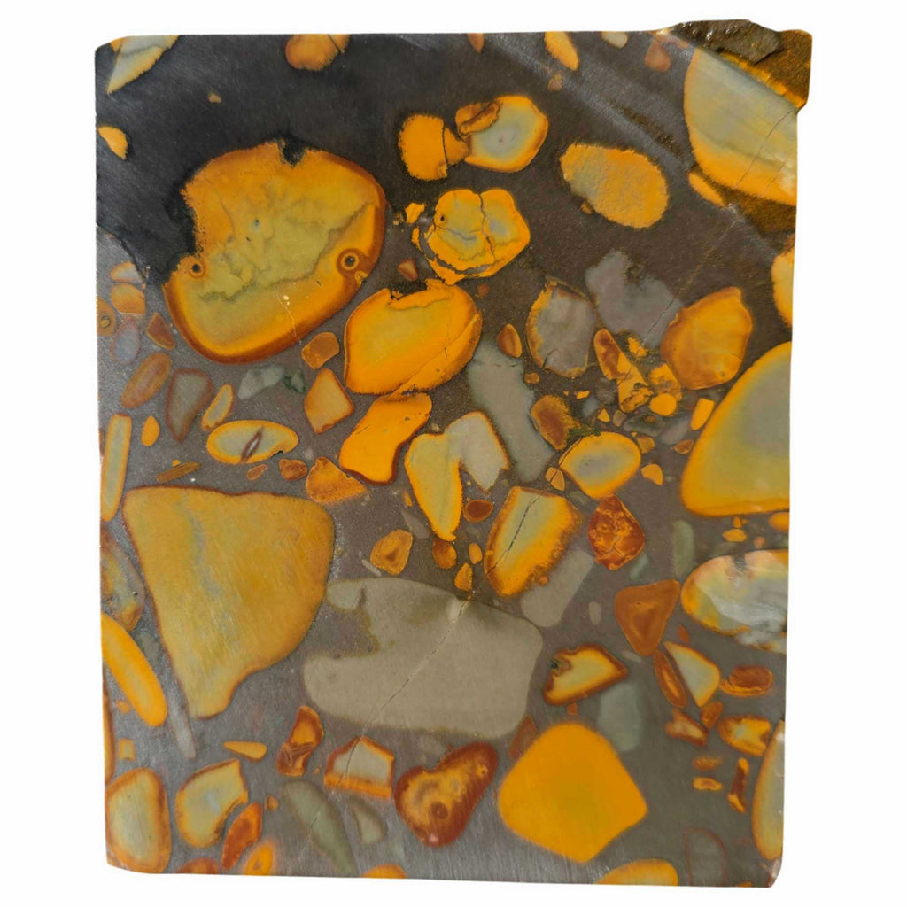 Natural Stone: This is a cut, unpolished slab of natural Bamboo Jasper. It may include natural pits or internal fractures from its geologic formation.