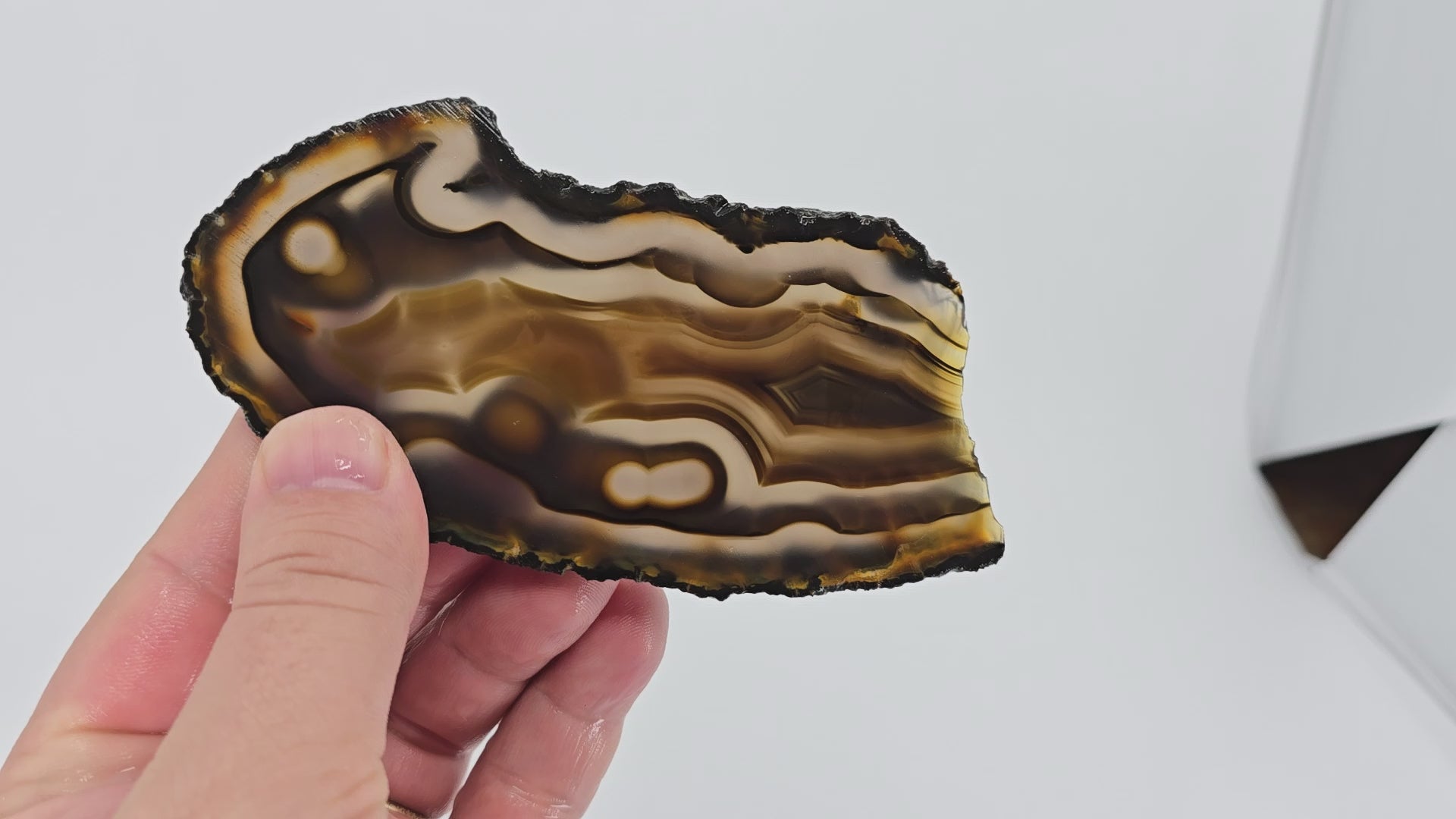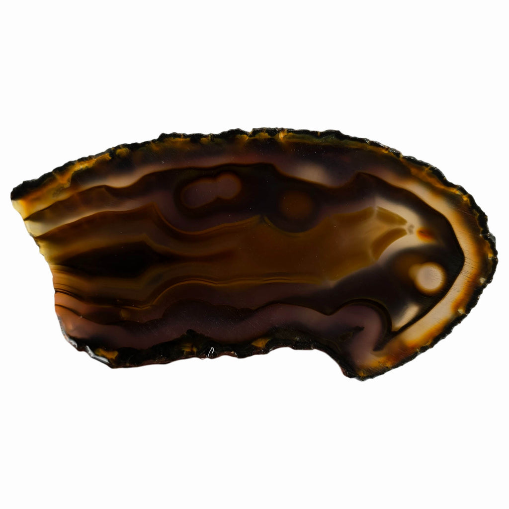 This neat slab of darker Brazilian agate shows orange banding with black fortification creating dramatic contrast. This one also displays neat tube features and makes a spectacular backlit display with exceptional depth.