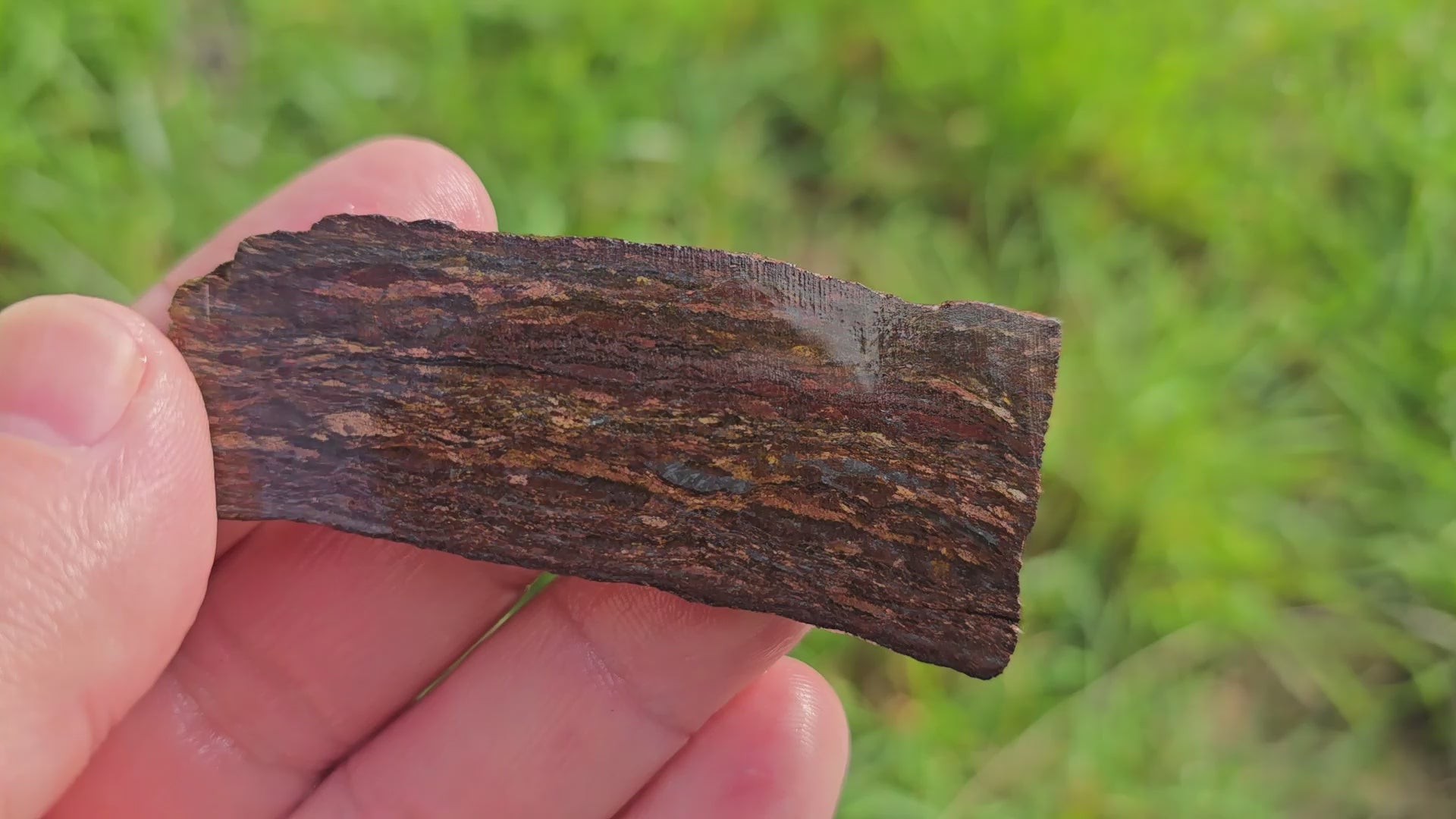 Here's a neat Bronzite slab with gorgeous blue bronze flecks that shimmer as you turn it. This material is known for its remarkable transformation potential - what appears modest in rough form reveals stunning metallic luster once polished. This slab could make one or two unique cabochons showing really neat pattern and effect.