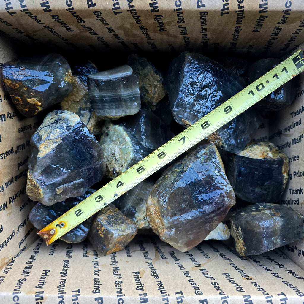WHAT MAKES THIS SPECIAL This box features meaty colors with deep purple and neat lace patterns throughout. When cut like a biscuit, pieces reveal fluorite crystal structures resembling a freshly frozen lake creating unique visual effects perfect for distinctive cabochons.