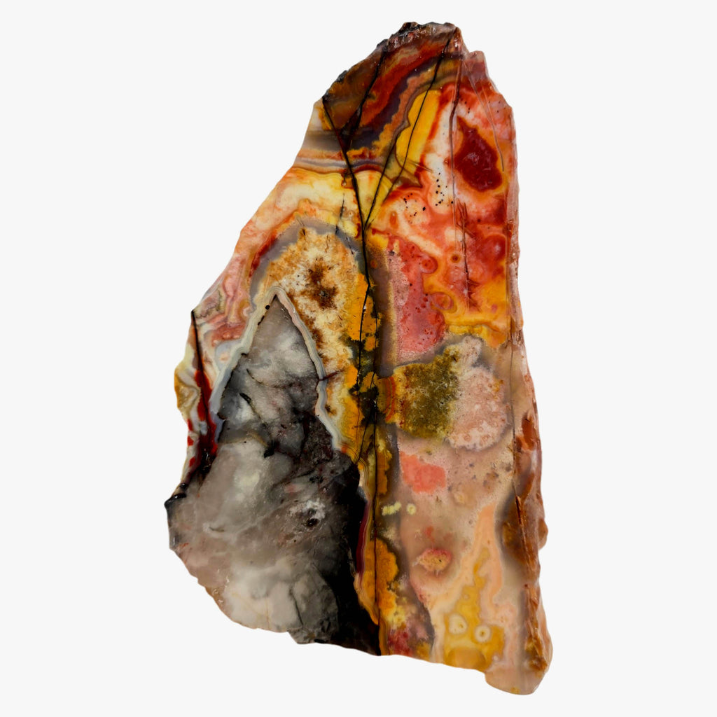 Flor de Durazno (Flower of Peach) Lace Agate is a subspecies of Mexican Laguna Lace Agate and Crazy Lace Agate with beautiful peach colorations and impressive lace patterns. It cuts remarkable cabs and tends to take a quality polish for finished jewelry. It has distinctive lace agate that makes captivating cabochons and is certainly a variety worth acquiring. This type of lace is considerably harder to source than standard varieties.