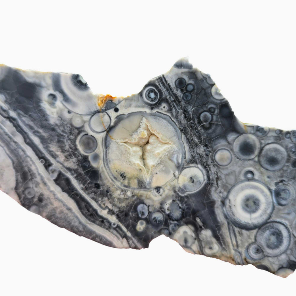 Galaxy Orbicular Rhyolite is a form of volcanic rhyolite from near Michoacan de Ocampo, Mexico. It can have a great amount of color variation from chunk to chunk, but they all have those iconic orbs that people love so much! Galaxy Rhyolite is a new one to us, and we are still learning to work with it, but from our own personal cutting, it appears that it will need to be treated in order to cab, due to hardness differences and potential naturally occurring fractures. It is still a super beautiful stone, especially in the rough, and we think it would make great collector stones for sure! For someone that does not mind treating stones, it could definitely make some really unique and attractive cabochons! Galaxy Rhyolite also goes by the name of Galactica.