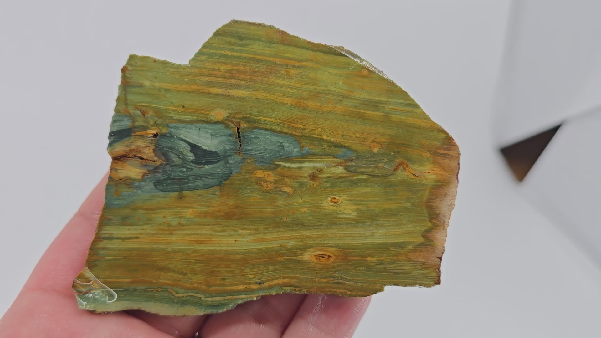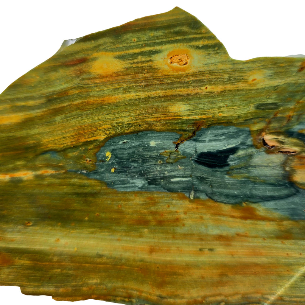 This captivating Gary Green Jasper slab displays metamorphic strata patterns resembling a desert oasis with a moon and stars scene. The soft-centered circles throughout add organic character you can work around, treat, or incorporate into your cabochons for a natural aesthetic. This Oregon classic should take an excellent polish for jewelry or display.
