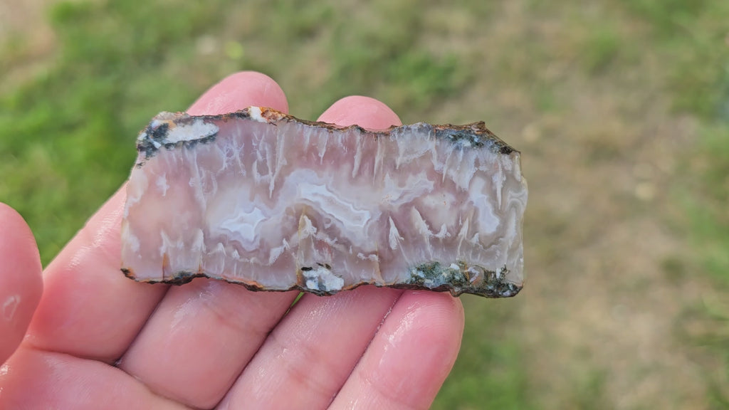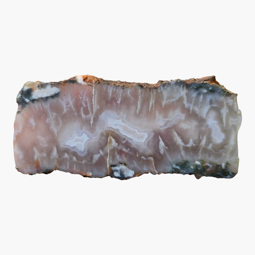 Ghost Seam Agate is seam material from the Sahara Desert of Morocco, collected by nomadic shepherds and prized for its ethereal appearance. This agate features light blue coloration with interesting fortification patterns that create unique visual effects. When cut perpendicular to the seam (like a biscuit), it reveals cloudscape-like scenes. Cut parallel to the seam, it displays fortification that can resemble ghostly figures, giving this stone its distinctive name.