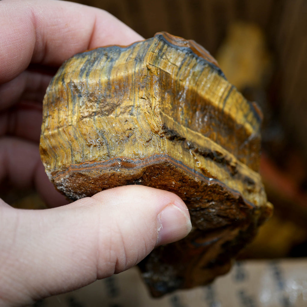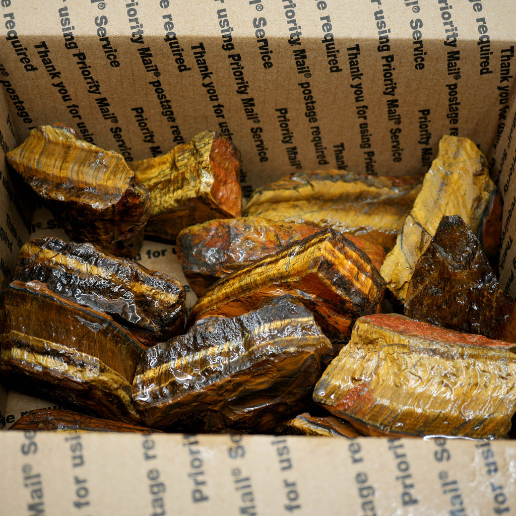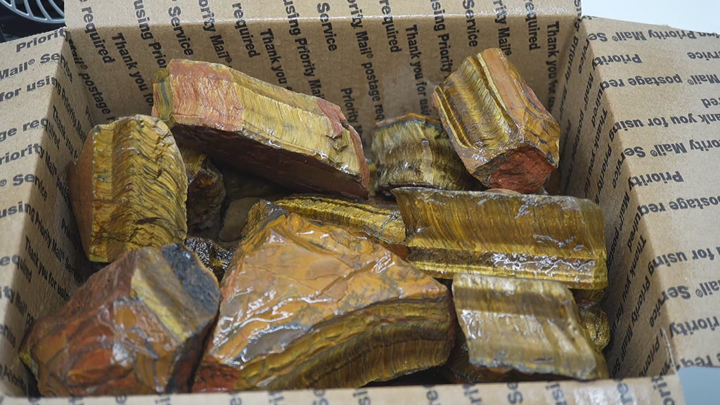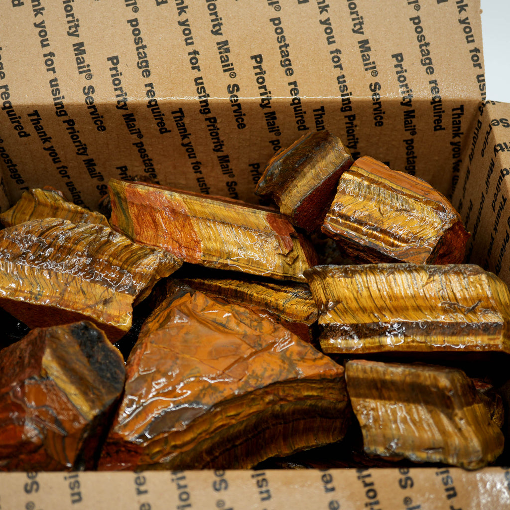 This stunning flat rate box contains Golden Tiger Eye rough showing really good flash with some natural Hawkeye (blue tiger eye) mixed in. These pieces look pretty solid and should make nice slabs for cabochons or display. This is a great value box for tiger eye enthusiasts.