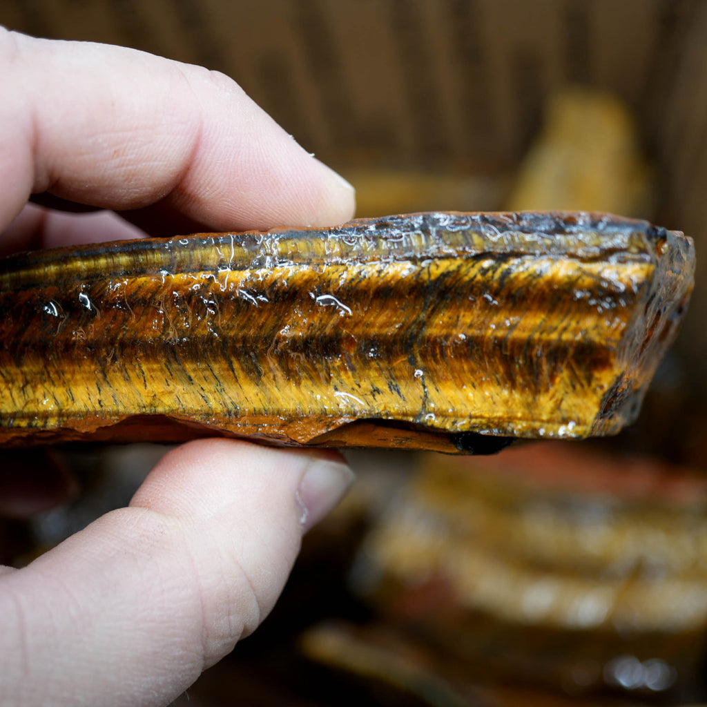 Golden Tiger Eye is a classic form of tiger eye with flashy chatoyant characteristics that led to worldwide popularity. It takes a quality polish and works into remarkable cabochons for jewelry. When wet and moved slowly, it produces an optical effect inside the stone. Hawkeye Tiger Eye is a naturally blue form of tiger eye with flashy chatoyant characteristics, becoming increasingly difficult to find as sources deplete.
