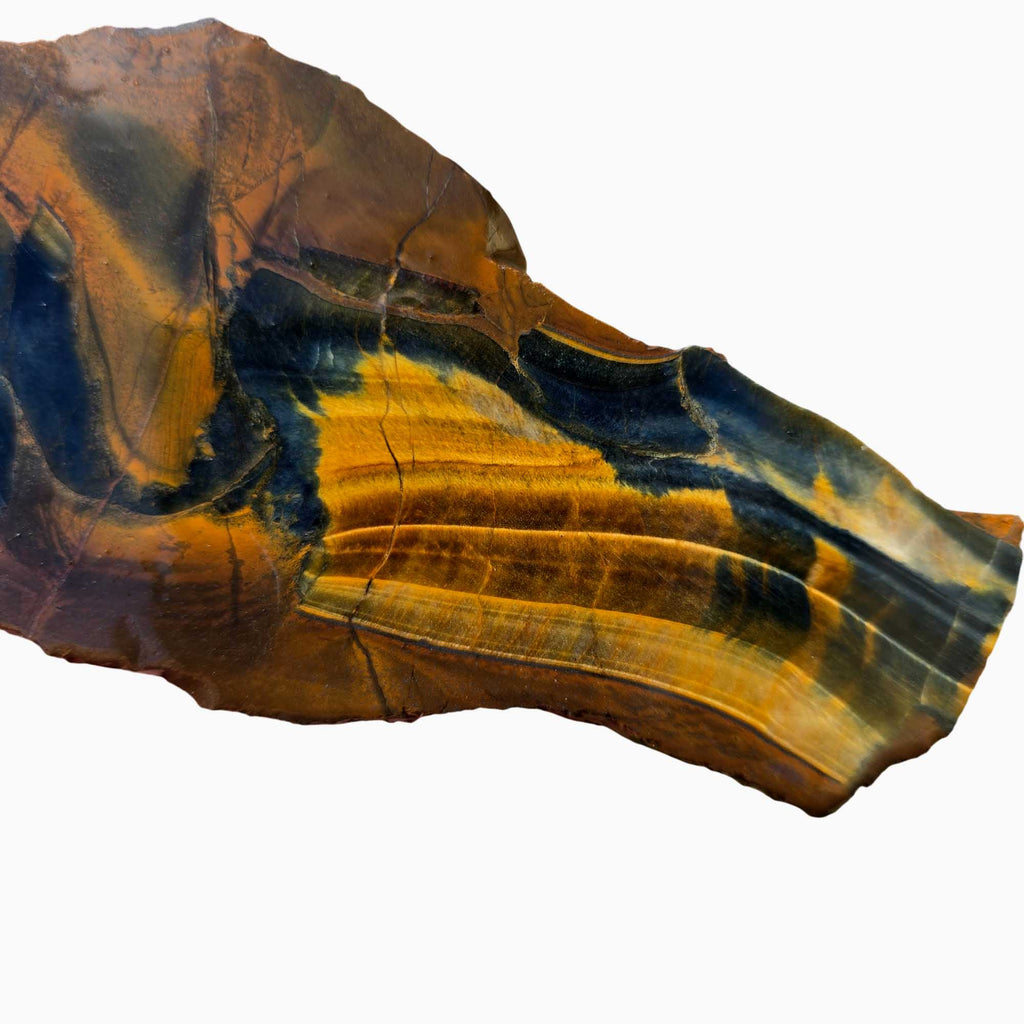 Gorgeous blue tiger eye with golden flash section and amazing hematite-based jasper creates striking contrast in this Hawkeye slab. This naturally blue form features great pattern and colors and should take a good polish or work into great cabochons for exceptional jewelry.