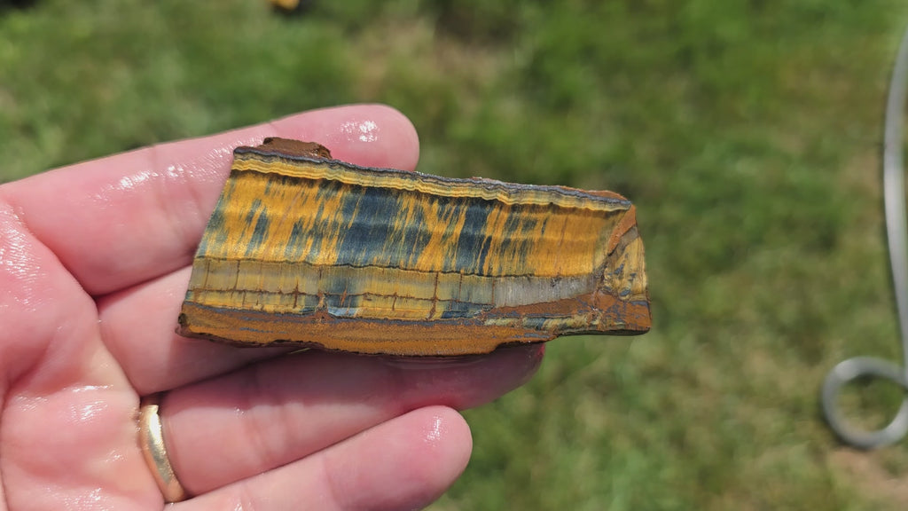 Hawkeye Tiger Eye is the naturally blue variety of Tiger Eye, known for its silky luster and bold chatoyance. When moved under light, this material exhibits a striking optical shimmer that gives it a dynamic, almost liquid appearance. It takes a fantastic polish and is prized for producing vivid, high-contrast cabochons. Hawkeye is becoming increasingly hard to source quality rough—making it a favorite among lapidary artists and collectors looking for something both flashy and unique.
