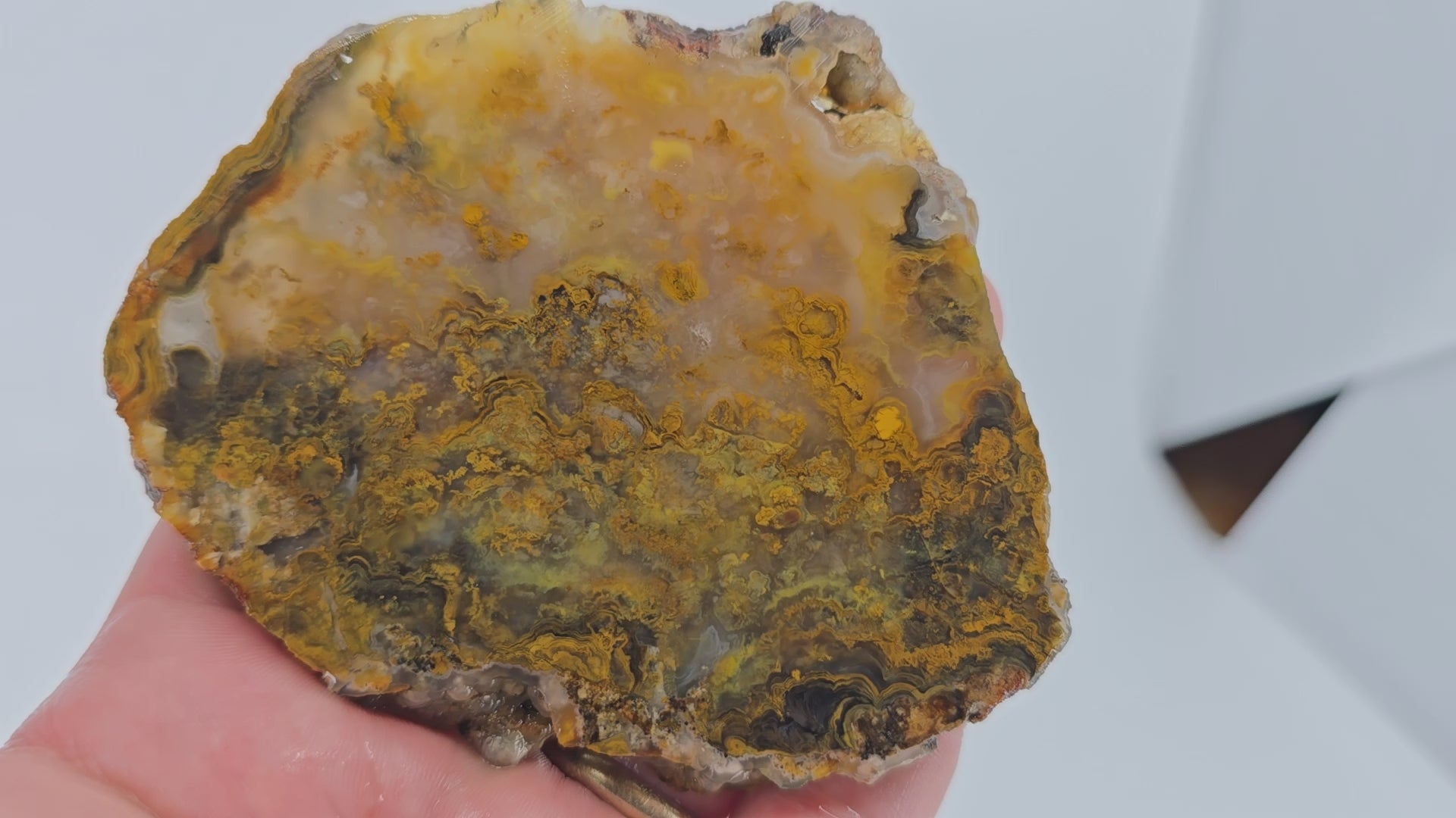 Jumpin' Jeep Agate is attractive old stock agate dug near the Painted Hills by Mitchell, Oregon. It has gone by many names throughout history: to locals, it's known as Mitchellite; to original miners, it's called Jumpin' Jeep; and it's also known as Oil Paint Agate and Butterscotch Agate. The material got its name after the mine's parking brake gave way while loading boulders, and the miners watched their jeep bounce down the steep mountain.