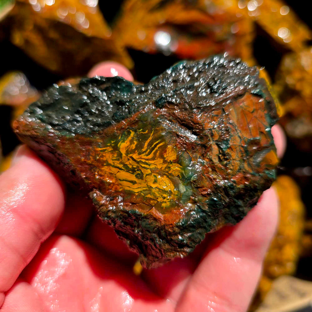 Many varieties of Kaleidoscope are believed to be bog wood formations, often containing fossilized organic debris, including wood fragments and other plant material. With over a dozen known varieties discovered across different deposits, every Kaleidoscope stone is truly one of a kind.