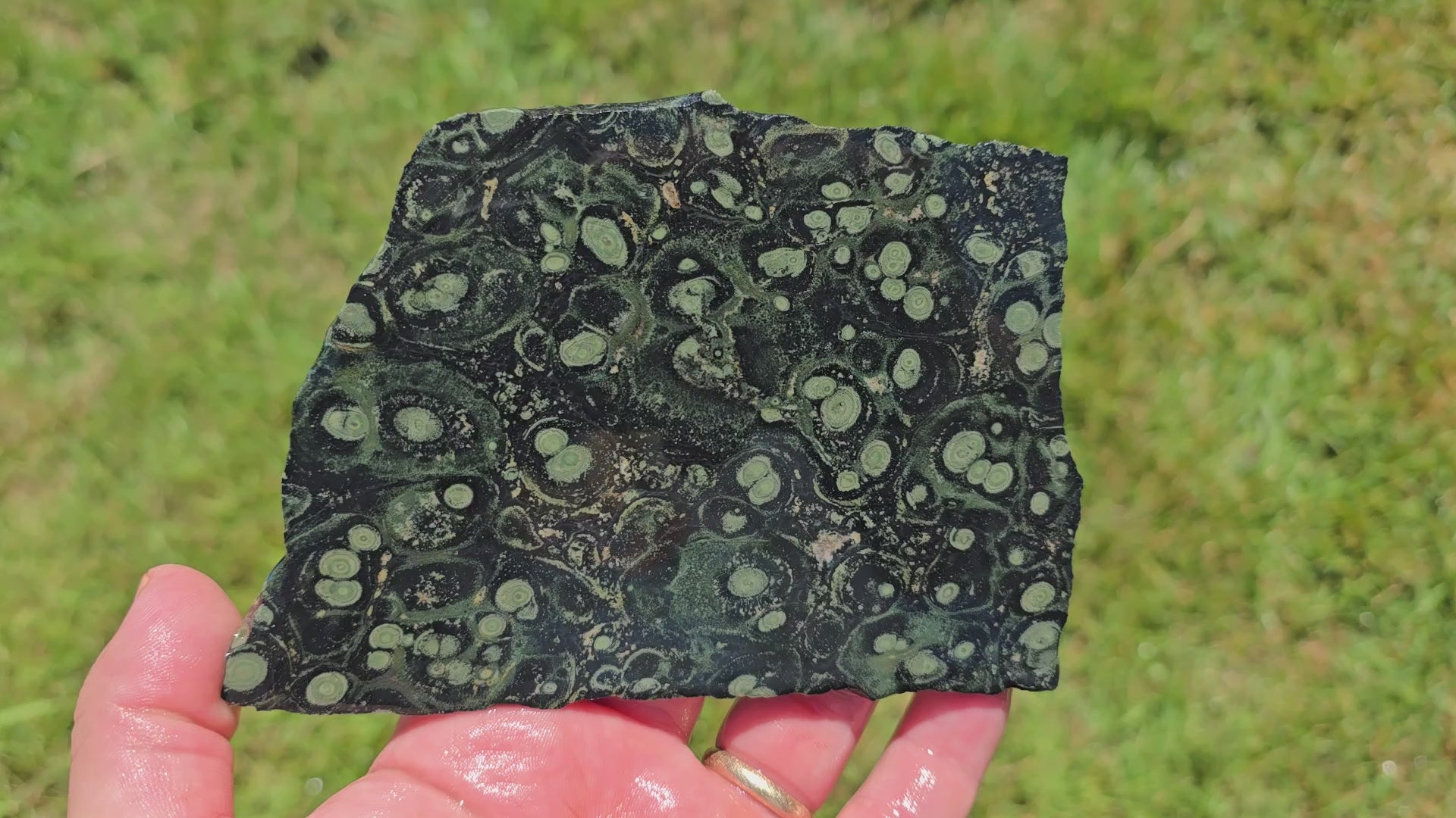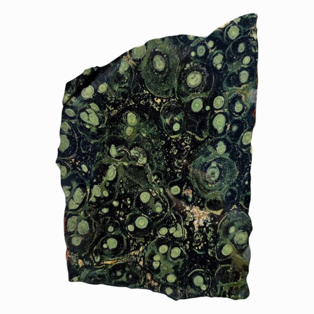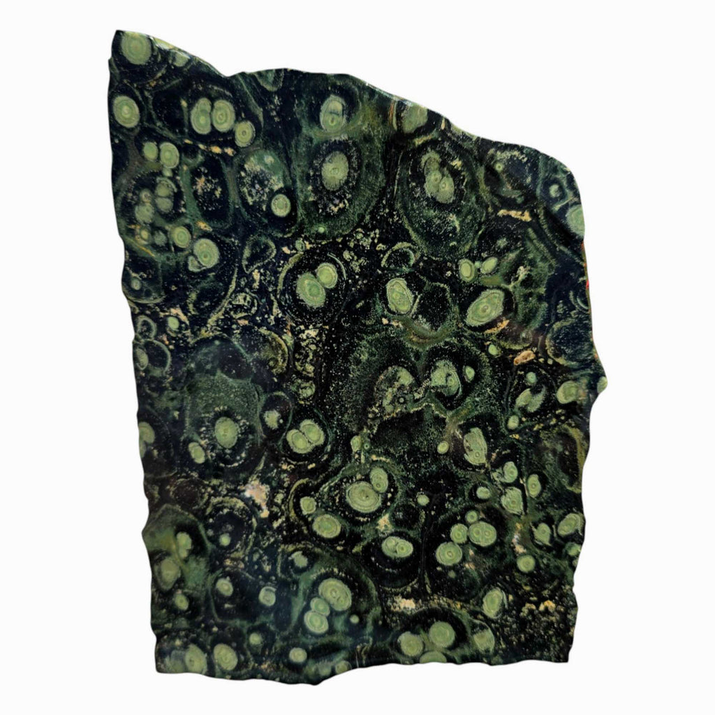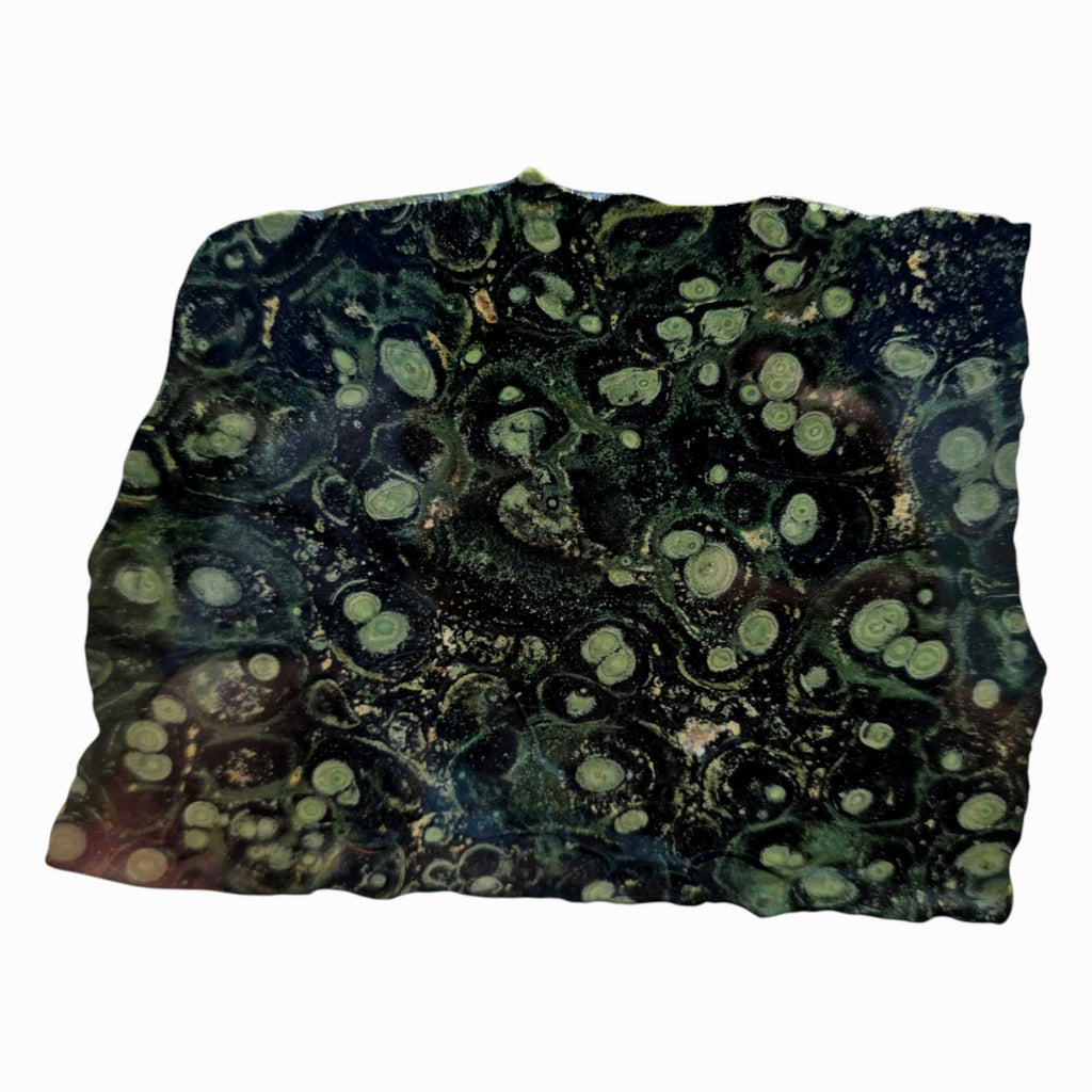 This meaty slab of Kambaba Jasper shows off a fantastic display of orbicular stromatolite formations, with layered green and black patterns that swirl across the face. It’s generously sized with plenty of usable space for cabbing, making it a practical and visually compelling choice for any lapidary artist.