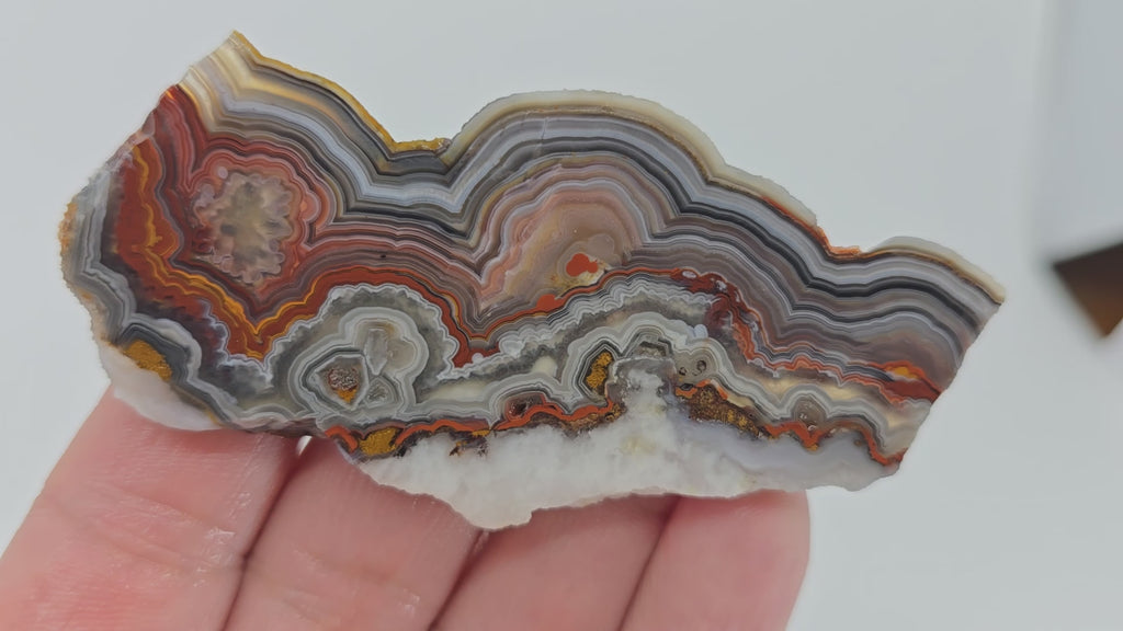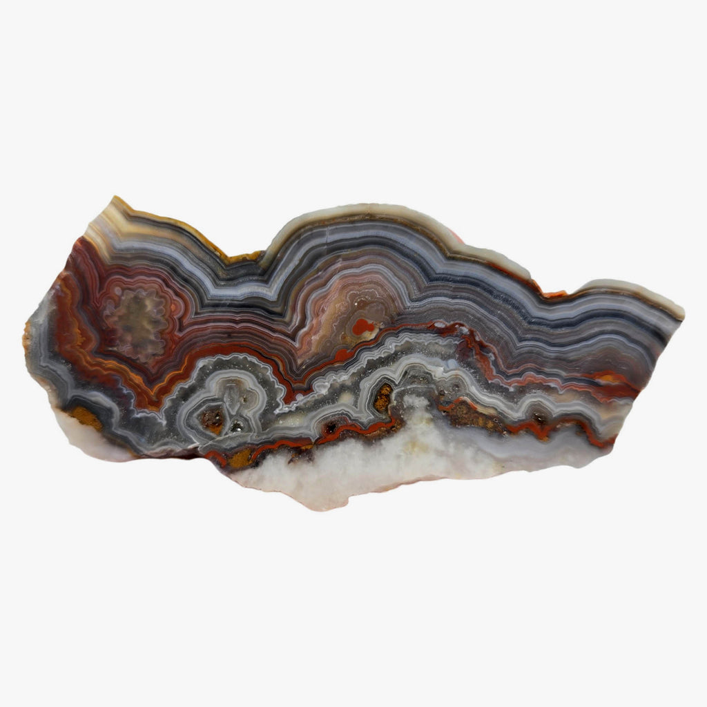 Laguna Lace Agate is a variety of Mexican lace that often has dominant red present with attractive, well-defined lace patterns throughout. It tends to be quite solid, with most deposits never having been blasted, preserving natural quality. It makes excellent cabs and is one of the most popular lace varieties on the market for good reason. The vibrant red coloration combined with intricate lacing creates bold statement pieces.