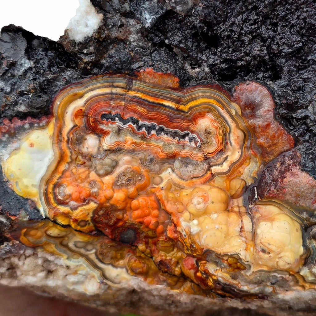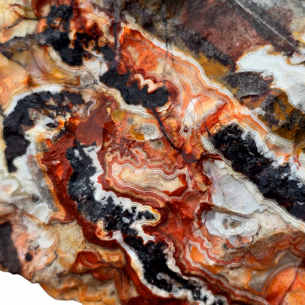 Unique Characteristics: Bright red and orange lace, intricate high-grade banding, excellent for cutting, cabbing, or display