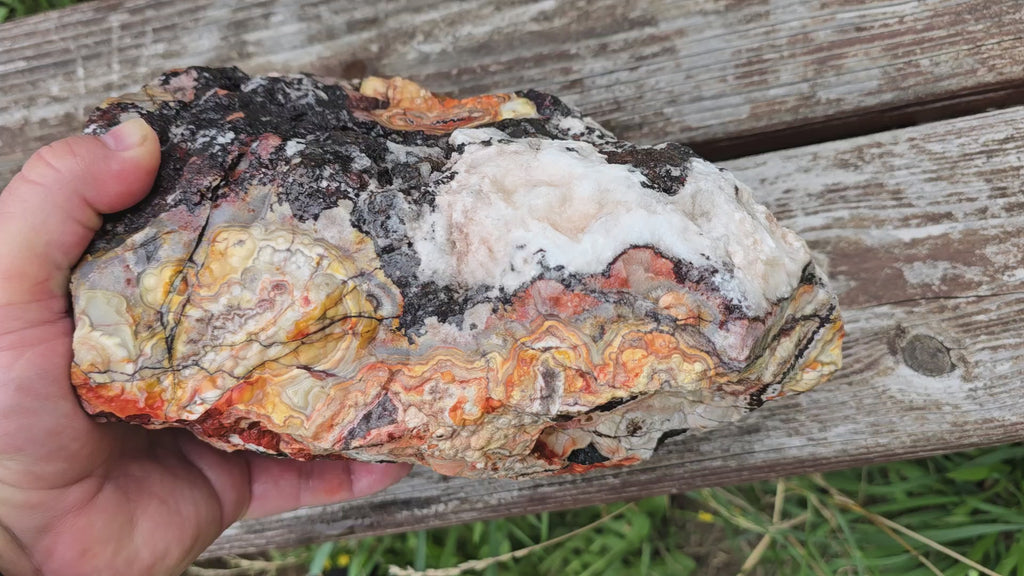 This large chunk of Crazy Lace Agate showcases bright red and orange lace patterns with intricate high-grade banding visible throughout. The stone’s size and strong visual movement make it ideal for slabbing into designer cabochons, while its natural lace formations give it stunning display potential as-is. Finding large, vibrant chunks like this is increasingly rare, making this piece a standout for serious lapidary artists and collectors alike.