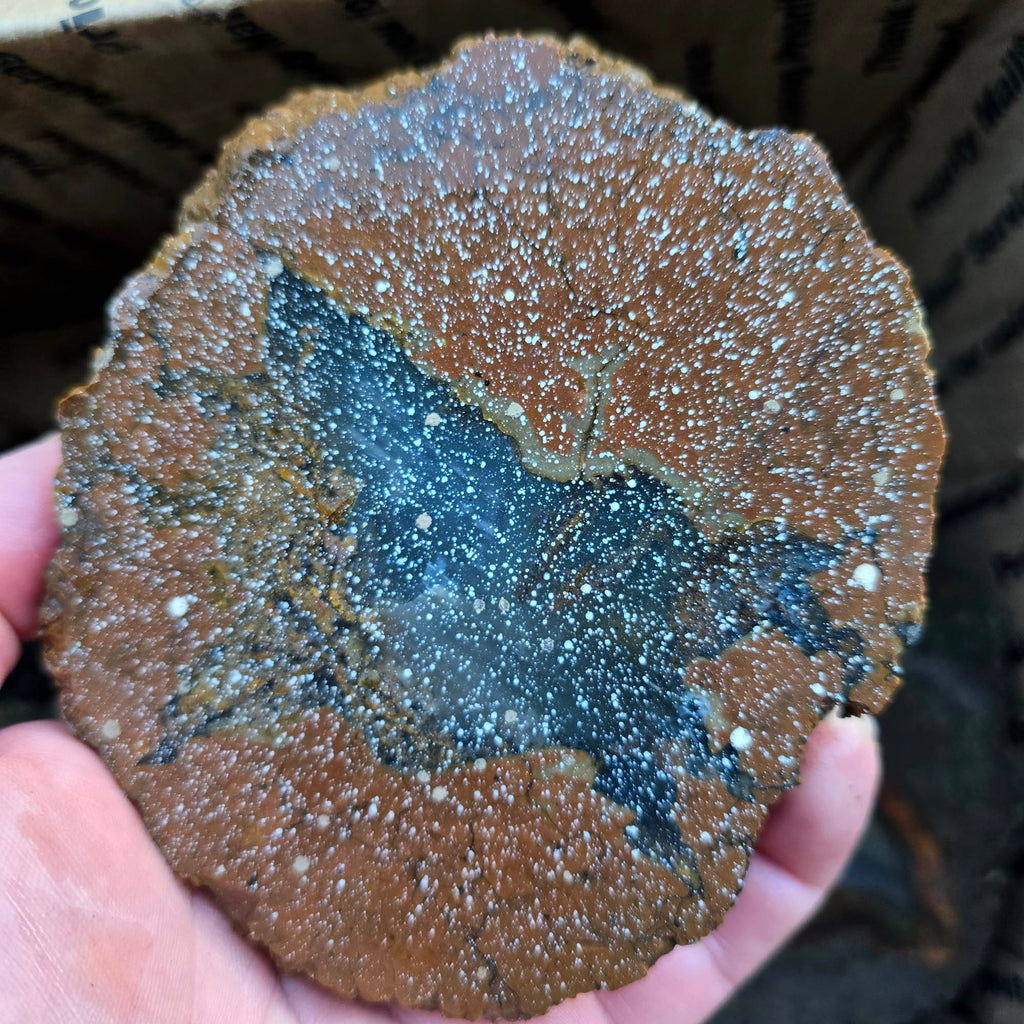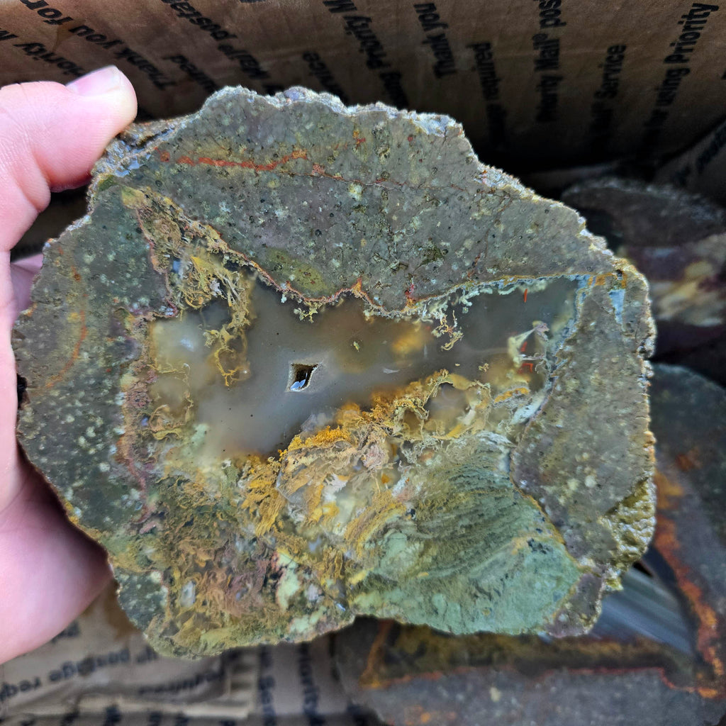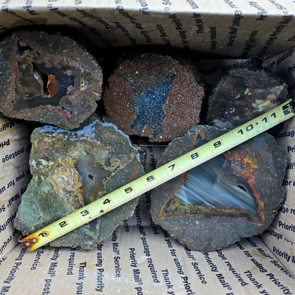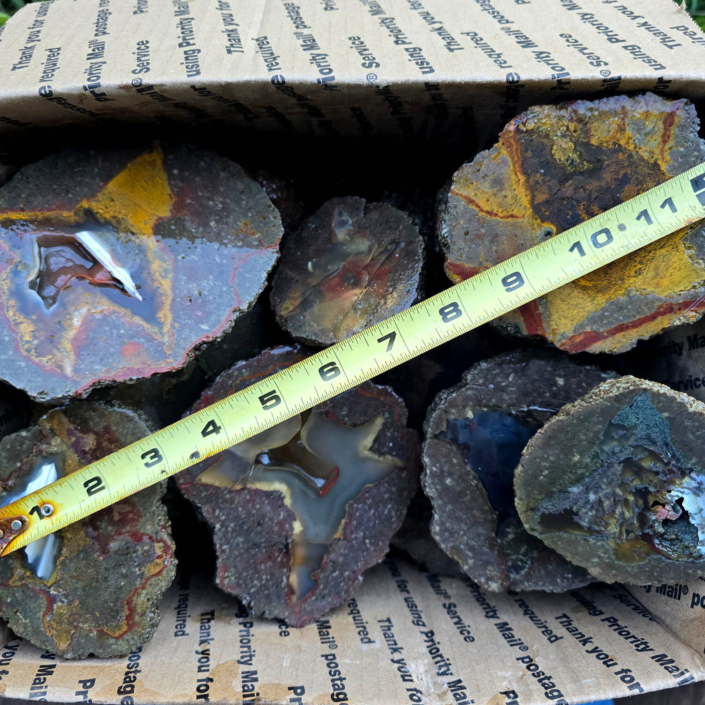WHAT MAKES THIS SPECIAL This box features masterfully cut Lucky Strike thundereggs by Calvin Boothe, a long time expert in Central Oregon. Some pieces have white paint that should sand off (please review photos to identify). This is a chance to get material an old rockhounding legend dug and cut himself - a prime investment for collectors.