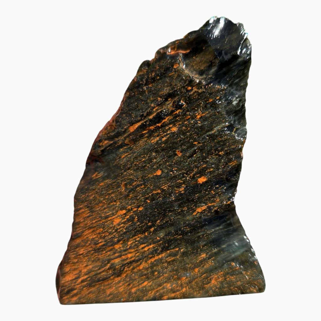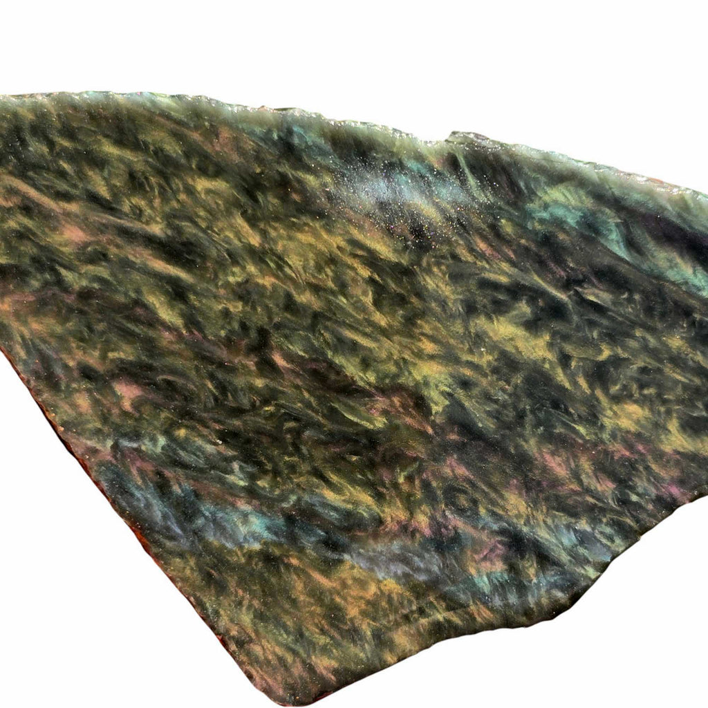 This piece of Mexican Velvet Obsidian features a cut face (unpolished) that reveals beautiful green velvet patterns beneath the surface. Known for its rich magnetite content, Velvet Obsidian displays internal flashes and silky textures that shimmer under the right lighting. The color is light-sensitive—similar to fire opal—requiring bright light and proper angles to reveal its full visual potential.