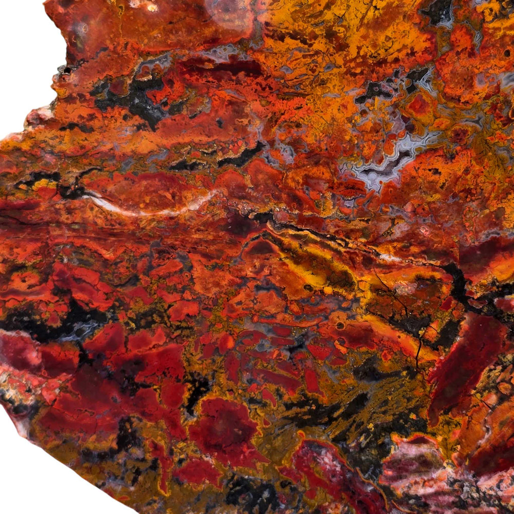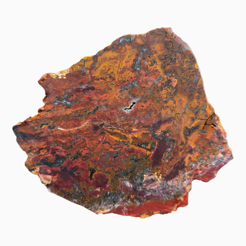 Color & Pattern: Deep reds with mossy jasper structures and hematite highlights