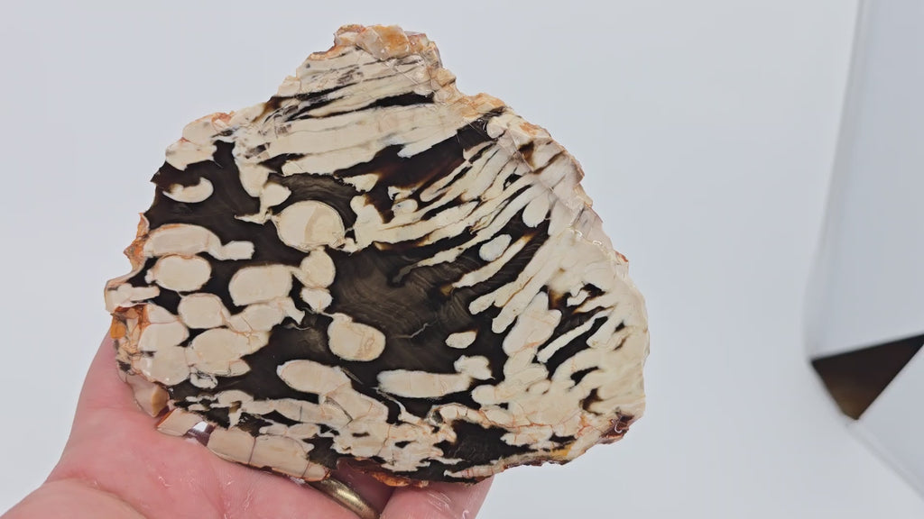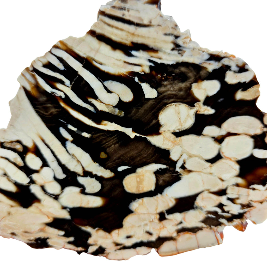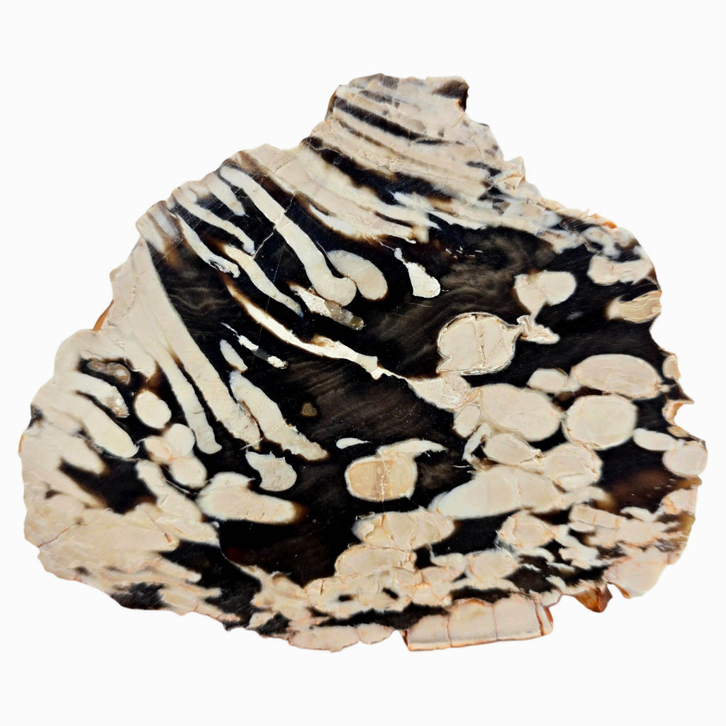 Peanut Wood is a rare petrified wood from near Carnarvon, Australia, offering unique paleontological interest. Believed to be Cretaceous driftwood, this material was colonized by shellfish larvae called Teredo (shipworm) that created holes, producing the characteristic white void-filled patterns that resemble peanuts. Limited quantities reach the market due to Australian collection laws that prohibit digging and only allow surface collection.