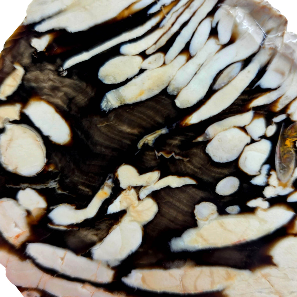 Peanut Wood is a rare petrified wood from near Carnarvon, Australia, offering unique paleontological interest. Believed to be Cretaceous driftwood, this material was colonized by shellfish larvae called Teredo (shipworm) that created holes, producing the characteristic white void-filled patterns that resemble peanuts. The material can have natural fractures and requires careful work when cabbing, but results can be exceptional. Limited quantities reach the market due to Australian collection laws that prohibit digging and only allow surface collection, adding to its rarity.
