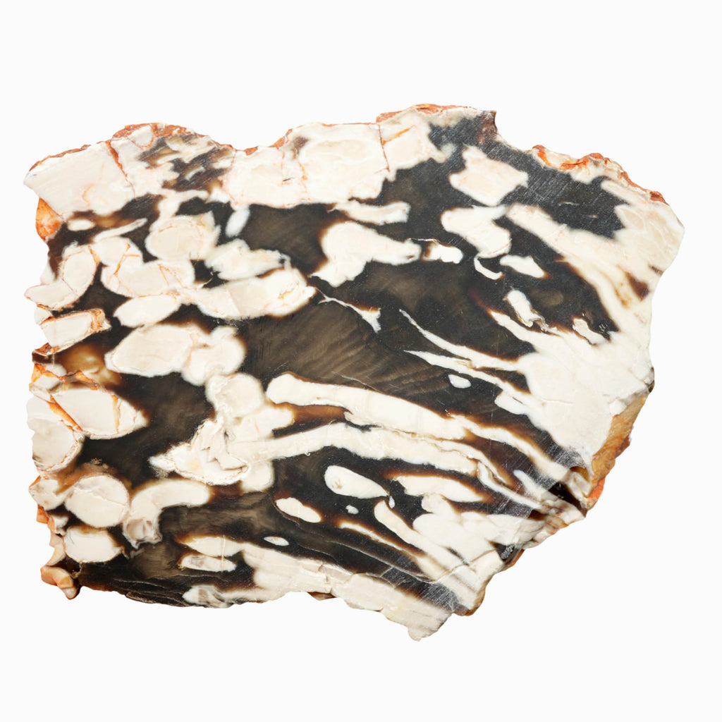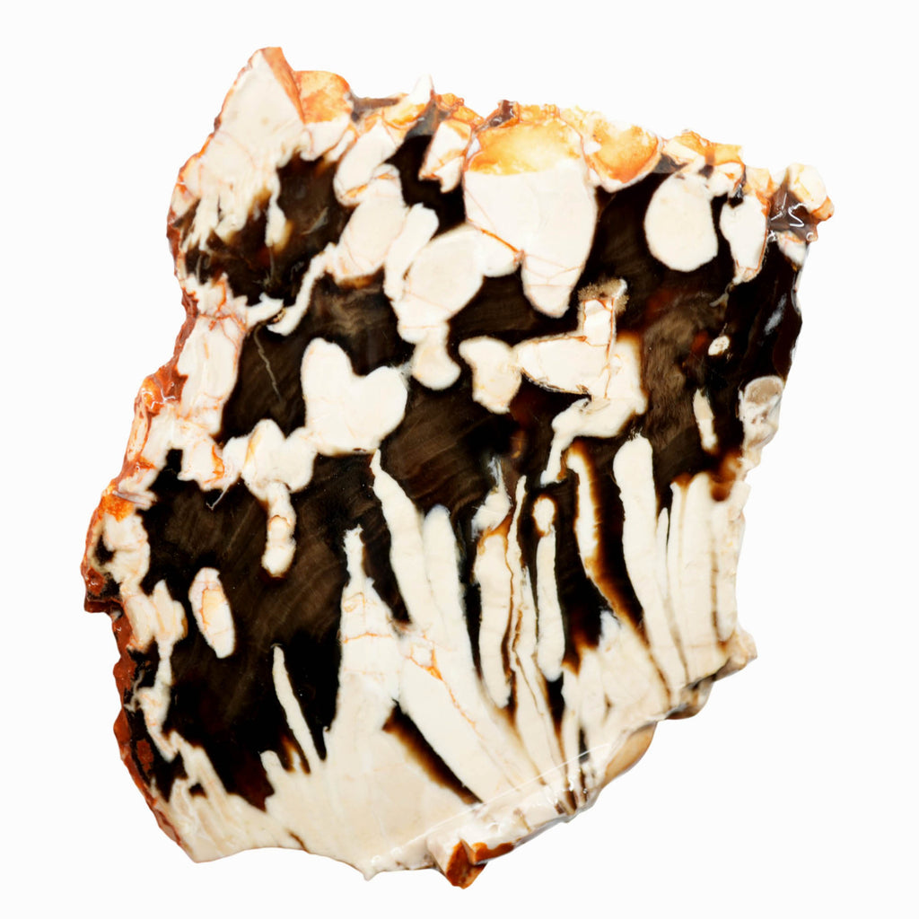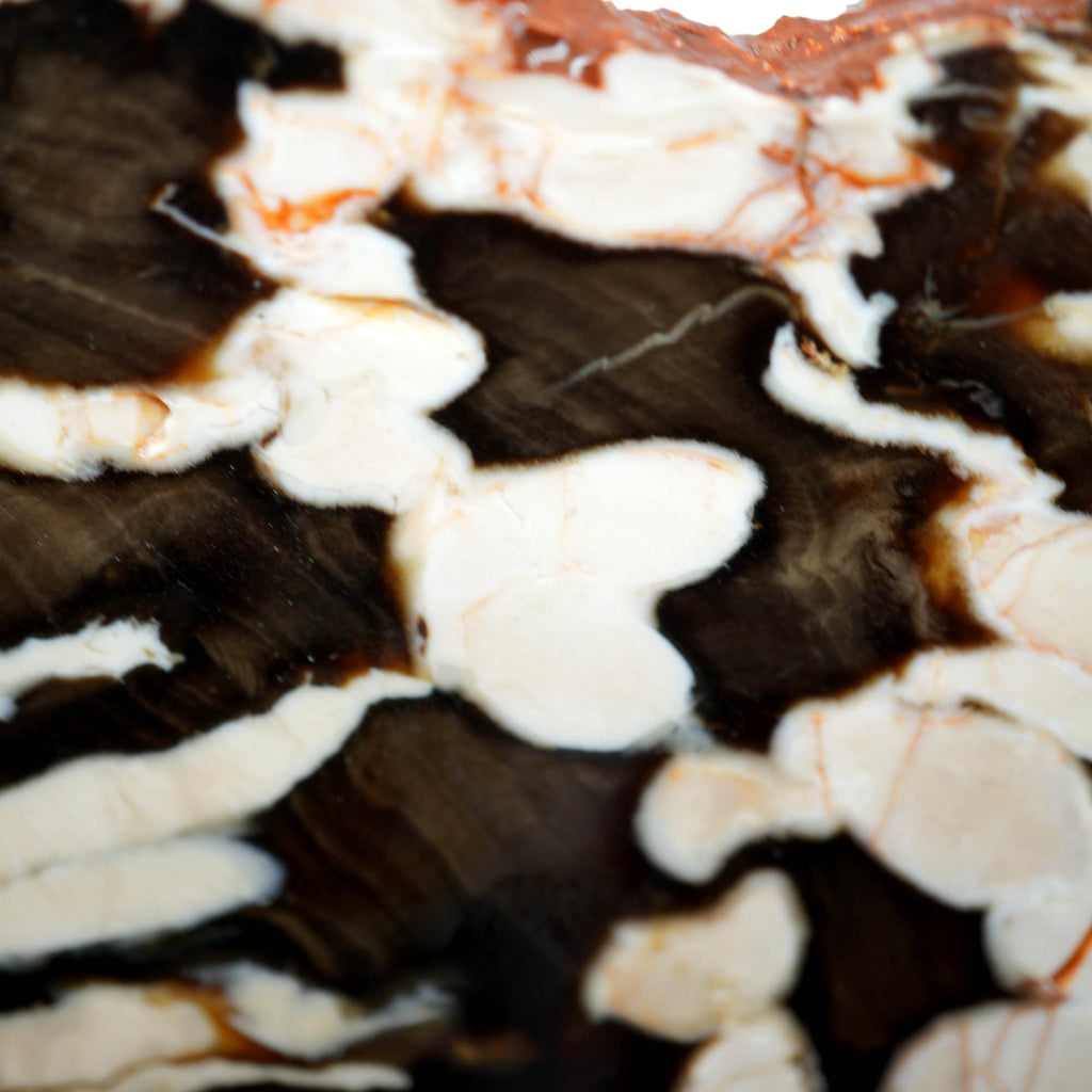 Peanut Wood is a rare petrified wood from near Carnarvon, Australia, offering unique paleontological interest. Believed to be Cretaceous driftwood, this material was colonized by shellfish larvae called Teredo (shipworm) that created holes, producing the characteristic white void-filled patterns that resemble peanuts. Limited quantities reach the market due to Australian collection laws that prohibit digging and only allow surface collection, adding to its rarity.