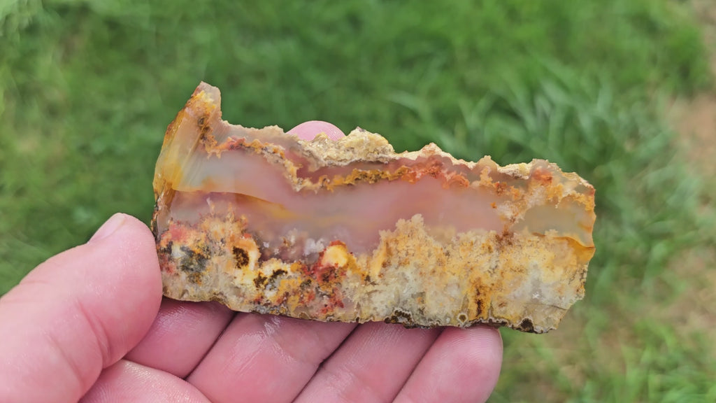This is a gorgeous old stock slab of Regency Rose Plume Agate featuring distinct plume-like structures and areas of transparent agate. At 2 oz, this piece is compact but highly attractive, with strong potential for cabbing or display. Its natural design ensures that polished surfaces will showcase intricate plume details.