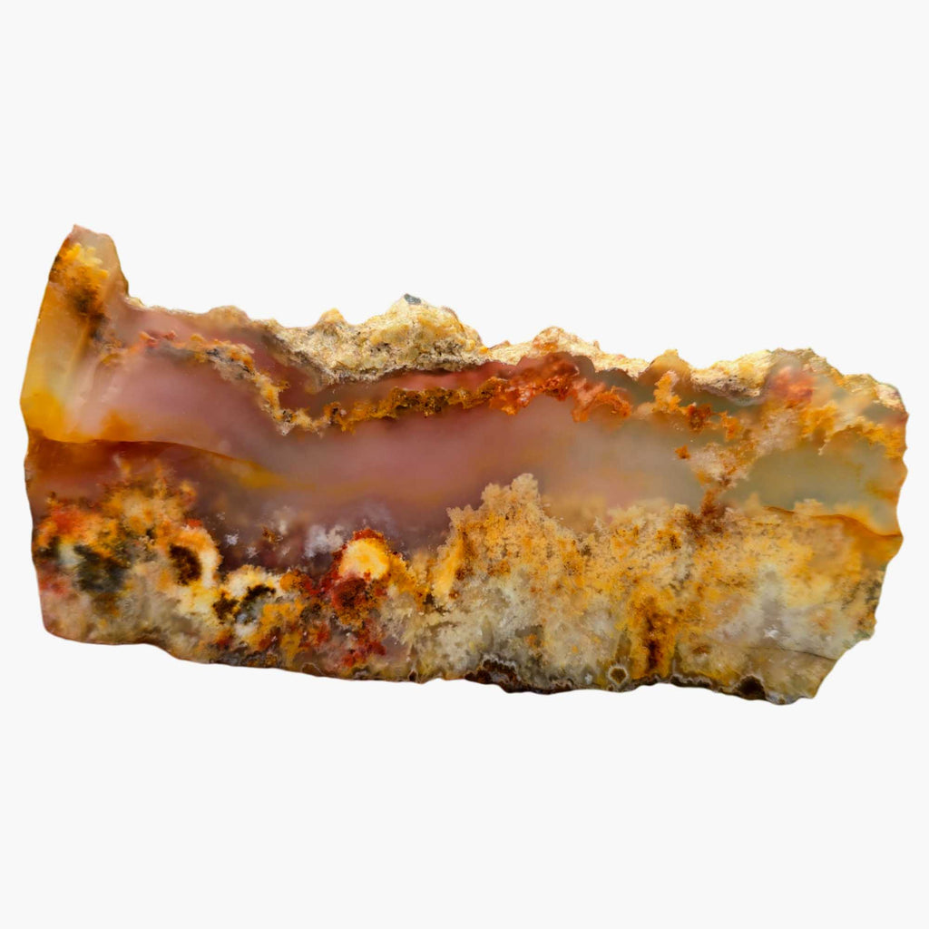 A rare old stock Regency Rose Plume Agate slab with red plume structures and translucent sections — a collectible specimen with strong cabbing and display appeal.