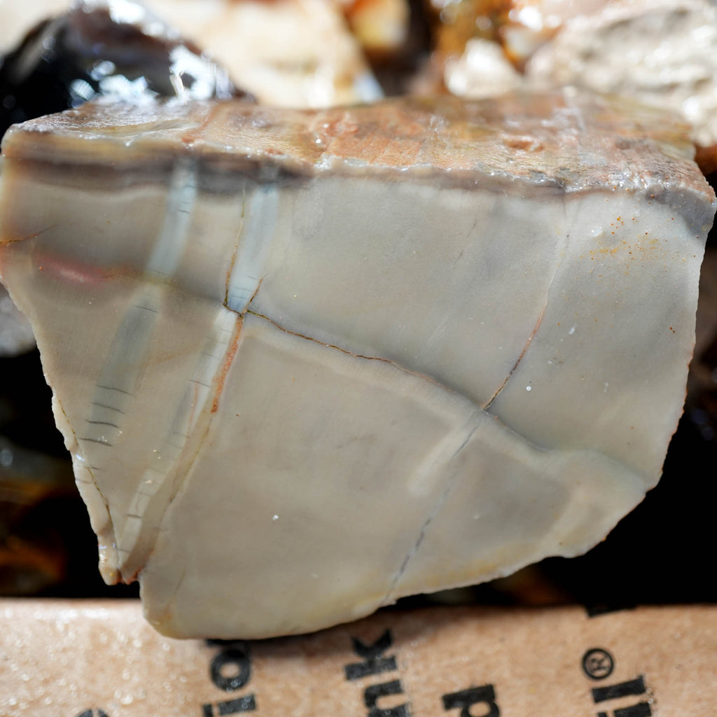 This flatrate features old stock estate sale material with excellent wood grain preservation. The cutters and trimmers are ready for slabbing, offering a productive box for any lapidary workshop.