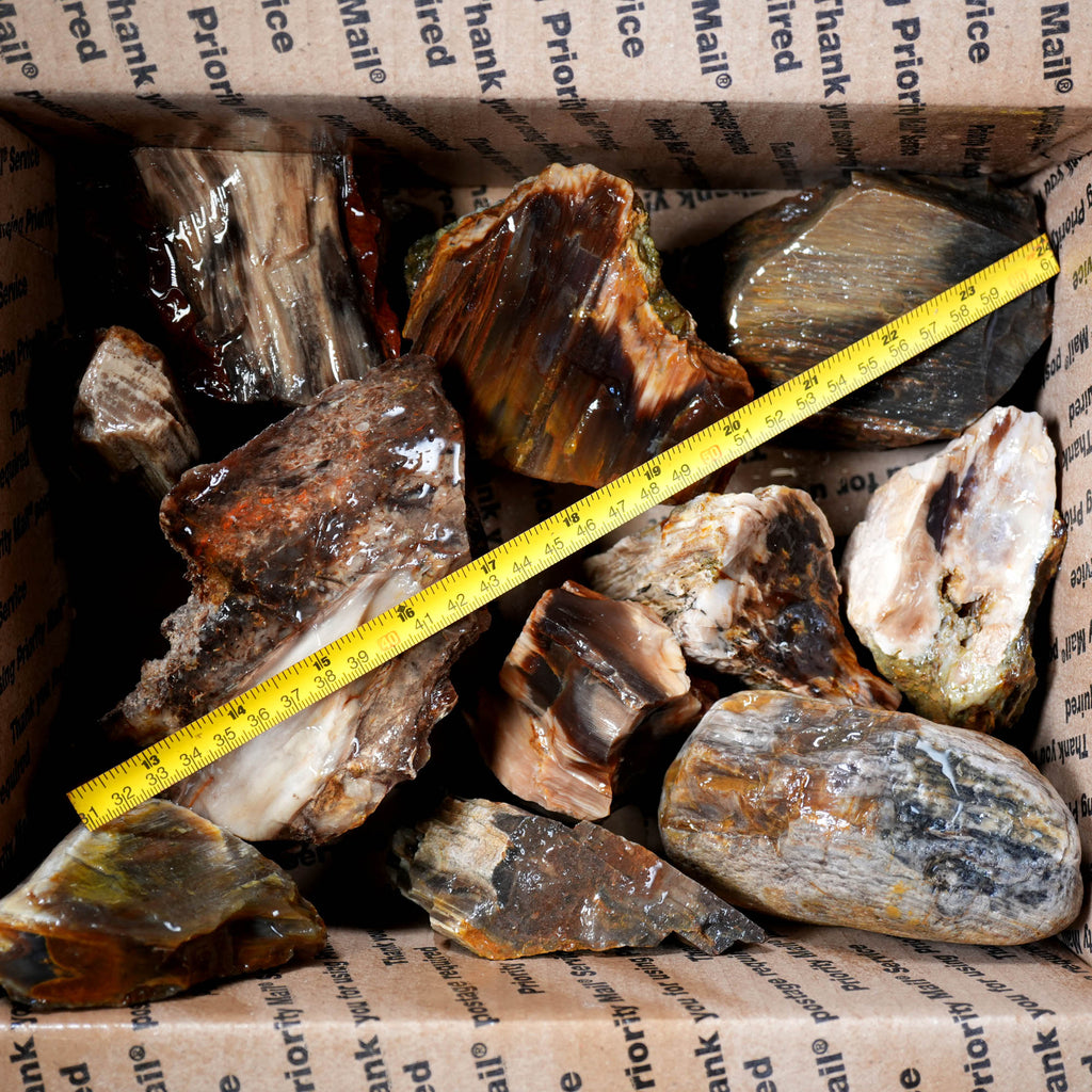 This flatrate of old stock Saddle Mountain Petrified Wood showcases excellent pattern and well-preserved wood structure in a generous mix of cutters and trimmers. Saddle Mountain is a world-famous location for petrified wood, and this box delivers on that legendary reputation. This material should be great for slabbing and producing quality cabochons.